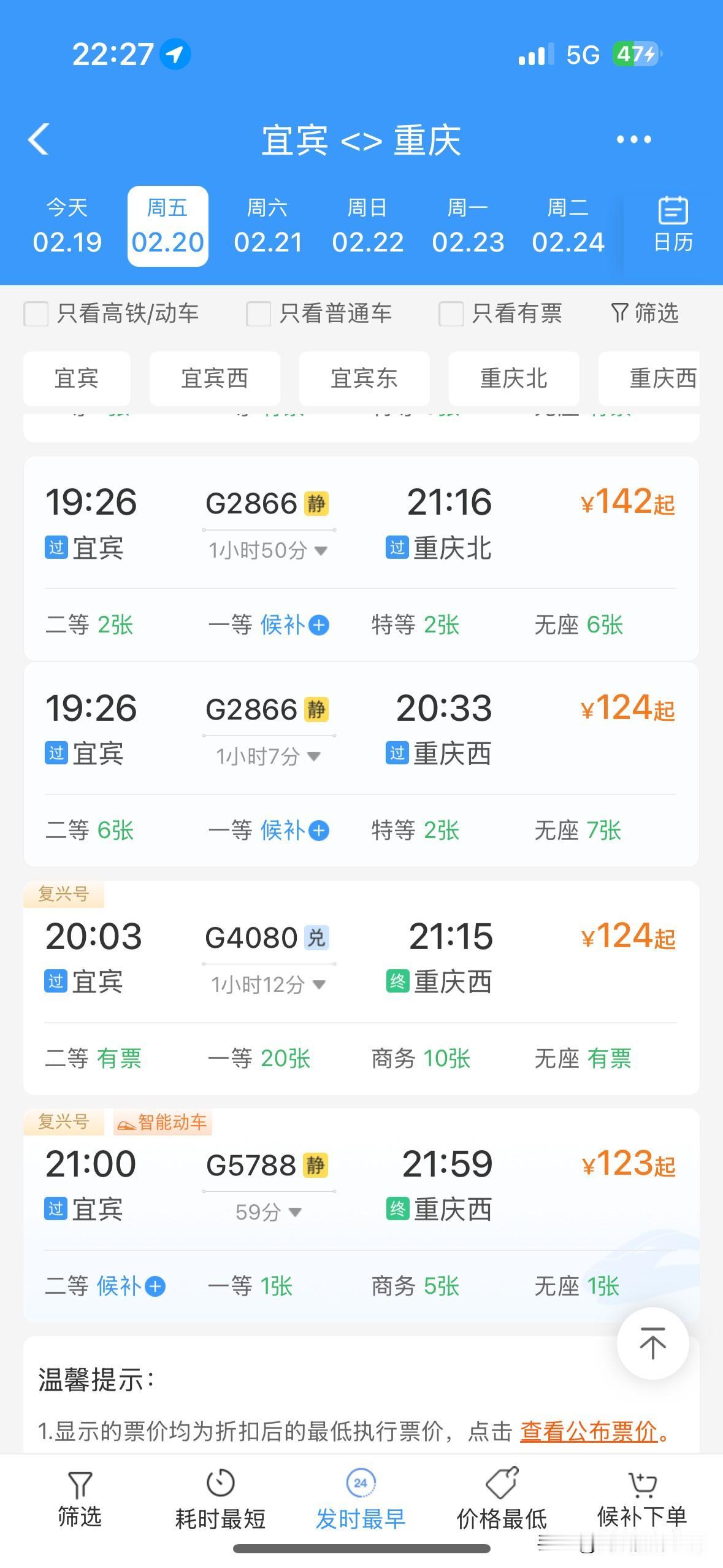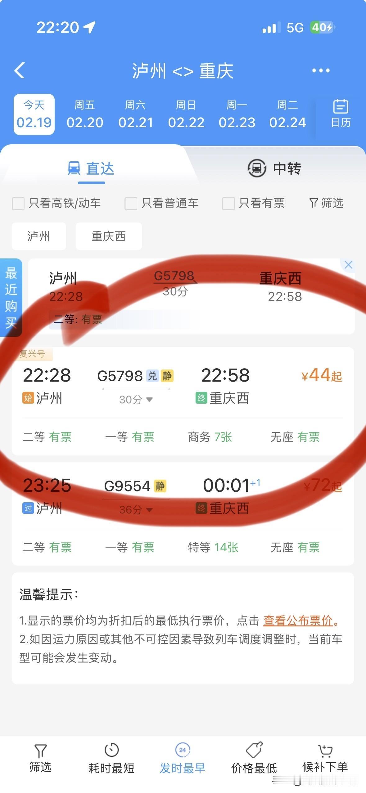 哎!我是因为穷,所以才放弃去宜宾坐高铁回重庆的啊!2月19日晚上,我乘坐的G 5798次高铁列车,从泸州高铁站到重庆西站,只要44块钱……但是,宜宾回重庆的高铁票最低也要113块钱…… 嗯,今天上午,我在宜宾南溪区,坐智轨到宜宾城区也才几块钱,但是我却选择花22块钱坐大巴车去泸州,到了泸州,玩一个下午和一个黄金晚上,晚上9点从大河街之水井沟公交车站坐公交车去泸州站,2块钱。 如果我要去宜宾玩到晚上9点再去宜宾高铁站,9点以后宜宾回重庆的高铁票,最低也要123块钱……关键是最后一趟车就是晚上9点,所以只能晚上8点之前就去宜宾高铁站,游玩时间更短。