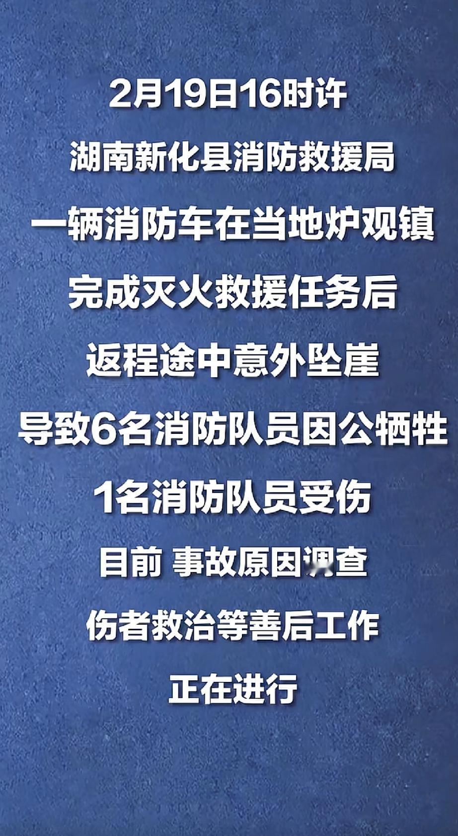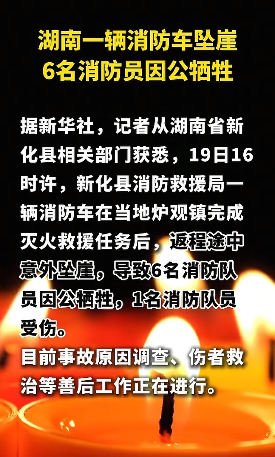 “泪目!”2月19日,湖南新化,一辆消防车意外坠崖,6名消防员因公牺牲,太令人痛心了…… 根据中国青年报报道,一辆消防车在当地炉观镇,完成灭火救援任务后,返程途中意外坠崖。导致6名消防队员因公牺牲。1名消防队员受伤,目前事故原因正在调查。伤者救治等善后工作正在进行。 网友们纷纷表示很痛心。 希望少一些事故发生,让这些消防员们出警安全回来。 晒图笔记大赛 (信息来源:中国青年报)