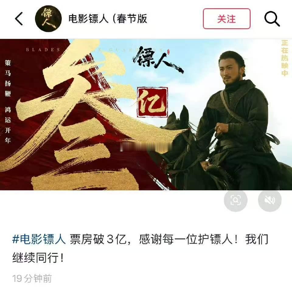 镖人官方感谢每一位护镖人 看完镖人就明白为什么这么多自来水,故事有温度打戏有力量,演员们都在用心诠释角色,票房破3亿是观众给的最好肯定,也谢谢这部电影守住了武侠情怀
