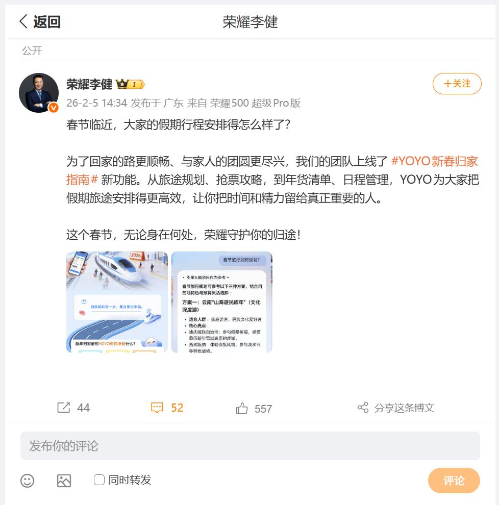 新年假期的出行和旅行计划,大家是如何进行规划的呢?查找网页、APP来甄选吗?这样会不会很辛苦呢?刚刚看到荣耀CEO李健,为小伙伴们找到了解决方案,利用和MagicOS的YOYO互动,就能够帮助大家完成旅途计划、抢票攻略、快递查询,大家觉得简不简单?畅聊数码新品 数码资讯