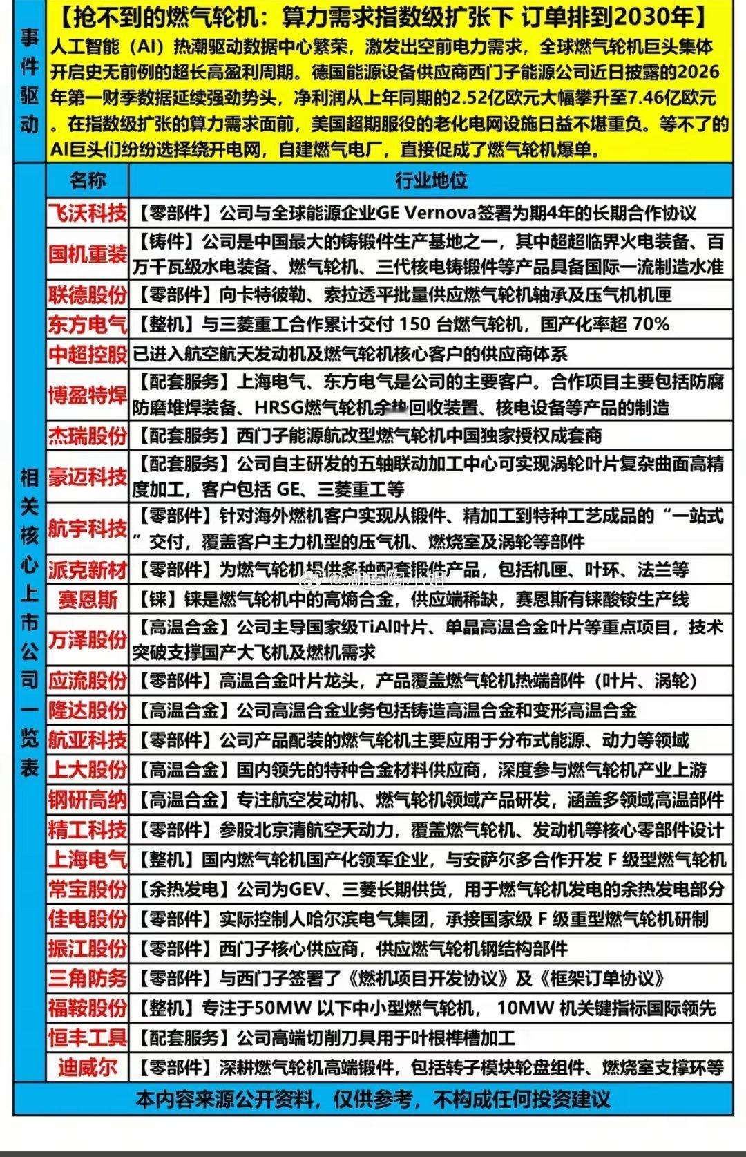 算力“饿”了,订单疯了:燃气轮机为何成了AI巨头们“抢”不到的香饽饽?你能想象吗?现在全球最抢手的“硬通货”,除了英伟达的GPU,居然是一堆“烧气”的大铁疙瘩。别觉得夸张。当全世界的科技巨头都在为算力疯狂砌服务器时,一个最尴尬的现实突然砸到脸上: “电”不够用了,而且老旧的电网根本喂不饱这群“电老虎” 。美国那帮等不及的AI巨头们,现在正干着一件极其“硬核”的事——绕开电网,自己买电厂。这就直接引爆了原本不温不火的燃气轮机市场。打开那份燃气轮机概念表,你会发现这不再是冷冰冰的机械制造,而是一条被AI“烤”热的黄金赛道。西门子能源最新财报已经炸了:净利润从2.52亿欧元飙到7.46亿欧元,翻了近3倍 。但这只是开始。GE Vernova的首席执行官现在估计是又爽又愁,订单量暴增80%,但大部分要到2027年之后才能交货 。全球三大巨头的在手订单,已经硬生生排到了2028乃至2030年 。为什么这么火?因为燃气轮机这玩意儿,简直就是为这轮AI狂热量身定做的“救火队长”。它不像核电站那样建个十年八年,也不像光伏看天吃饭。它启动快、占地小、功率密度是蒸汽轮机的十倍 。AI数据中心要的就是这种7x24小时“随叫随到”的暴力供电。而更令人振奋的是,在这场全球能源装备的“饥饿游戏”里,中国力量正从配角走向主场。就在前几天,我国自主研发的3兆瓦级燃气轮机(CGT3)刚发布,这意味着中小型燃机我们已经玩得转,完全自主可控 。看看表格里的上市公司,那种“万事俱备,只欠东风”的产业爆发感扑面而来:· 杰瑞股份成了西门子能源在中国的独家授权“大管家”,直接承接海外溢出红利 。· 应流股份和万泽股份攻克的可是“皇冠上的明珠”——高温合金叶片,这东西要在1000多度的高温里高速旋转,技术壁垒极高,现在正迎来国产替代的放量周期 。· 甚至连豪迈科技这样的加工巨头,五轴联动加工中心直接给GE、三菱做高精度涡轮叶片,妥妥的“卖铲人”逻辑。这不仅仅是一份名单,这是算力时代下,能源底层架构重构的“藏宝图”。当然,看着西门子订单排到2030年,看着GEV把20GW的扩产目标一再前提 ,我们必须清醒:很多核心零部件厂商的股价已经提前“狂飙”了。激情归激情,追高需谨慎。 现在的燃气轮机就像当年的锂电池,长逻辑无比坚挺——只要AI还在进化,只要算力还在膨胀,电力缺口就在那里。但短期涨幅过大的品种,需要等一等业绩的消化。真正值得下注的,是那些不仅能蹭上概念,更能像航宇科技、派克新材那样,真正打入全球巨头供应链,实现“一站式”交付的硬核玩家。算力时代,得能源者得天下。这场由AI倒逼的电力革命,燃气轮机的轰鸣,才刚刚响起。