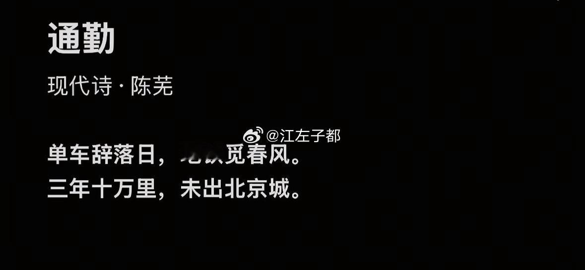 北京牛马通勤诗通勤现代诗。陈芜单车辞落日,地铁觅春风。三年十万里,未出北京城。