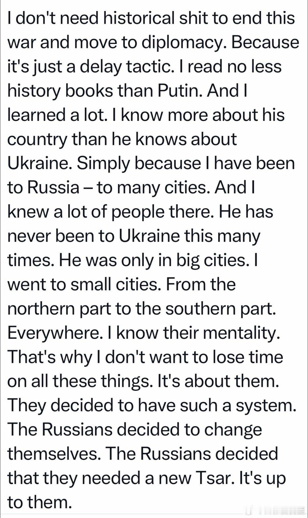 俄乌谈判破裂,Zelensky发文:别跟我谈什么狗pi历史,全是借口,我读的书不比他少,我对俄的了解比他对乌的了解多得多,我到过俄很多小地方,知道那些人怎么想的,谈某些事情纯属浪费时间,是他们自己想要这样的系统、想要个新沙皇…但我不得不谈,因为他们发起了战争、危及了我们的生命,我唯一想谈的,就是如何迅速结束战争、为我们提供安全保障