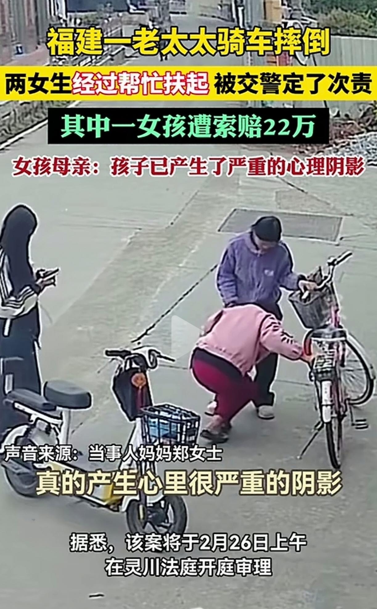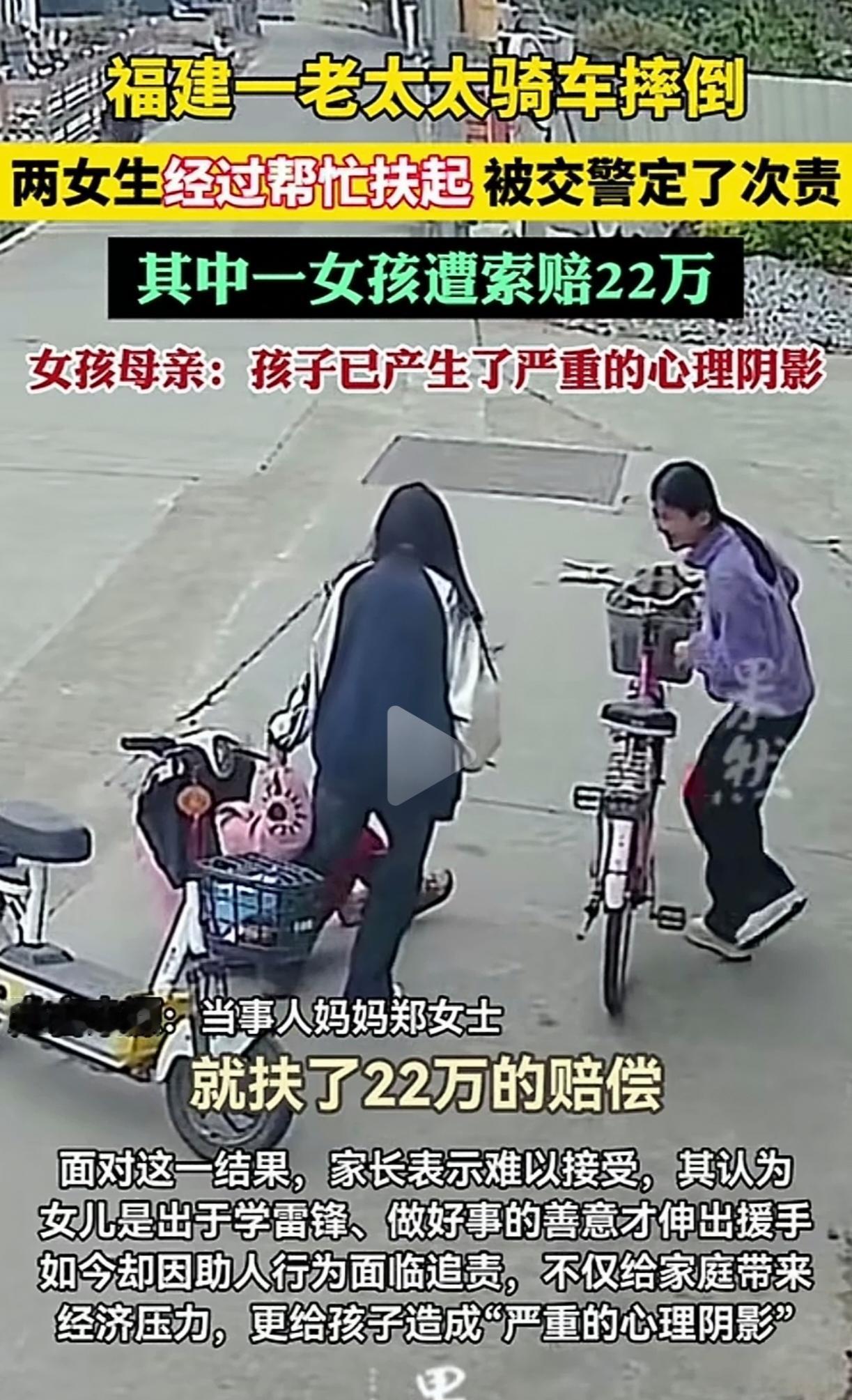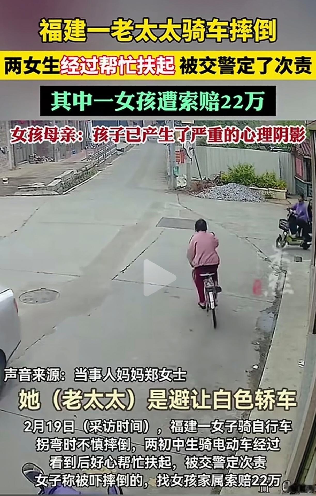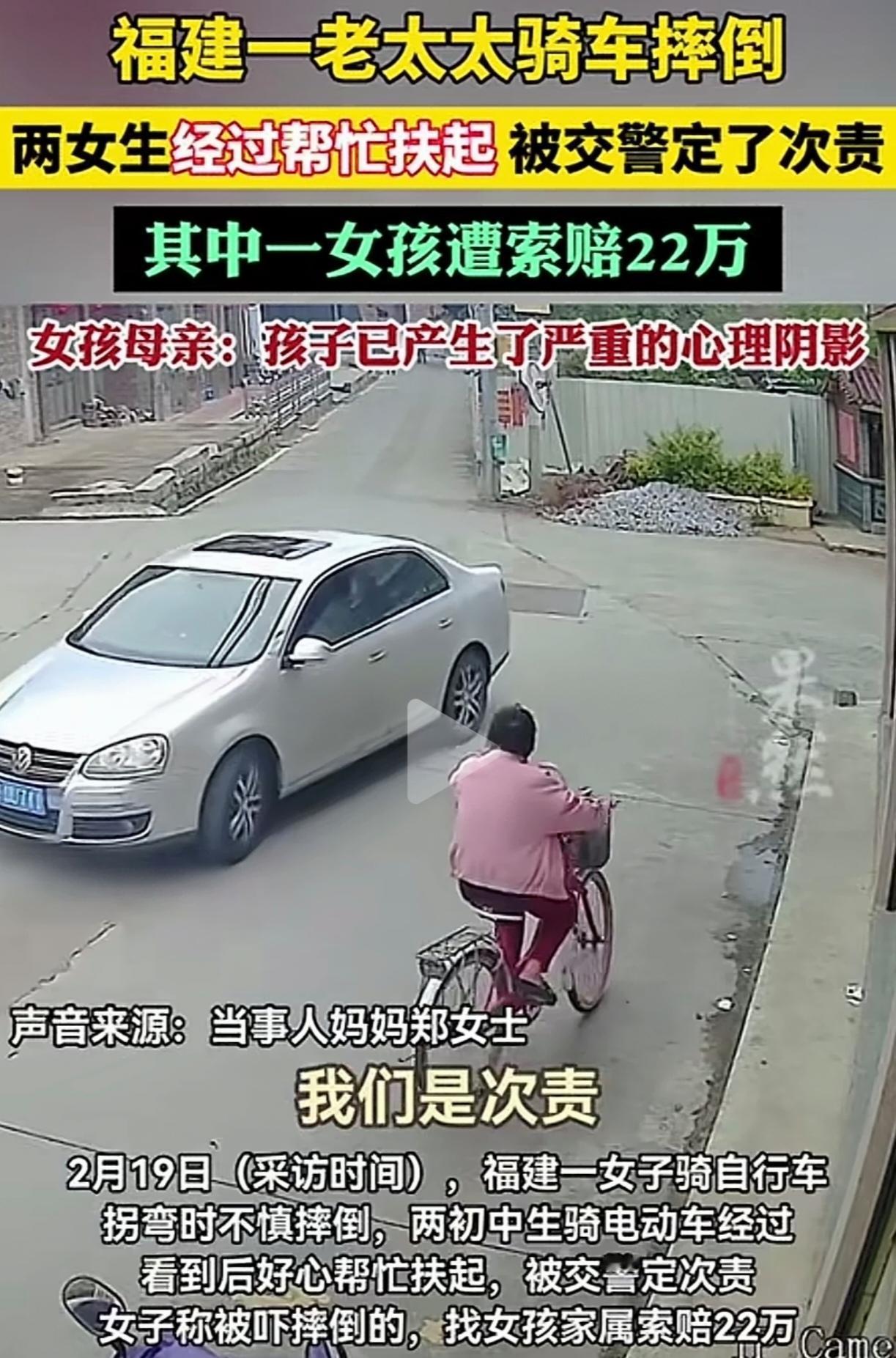 明明自己摔倒的,非要赖他人?以前的老话题,现在又被复制了。 以前看到这个视频没仔细看,今天又刷到这个视频显示老太太自己骑自行车,不小心摔倒。两名好心的中学生经过看到这一幕,还商量要不要扶?最后决定,做好事,扶起了这位老人,事后这位老人想向两名中学生索要22万的赔偿,不是中学生撞倒的,非要22万,是啥意思?说是被两位中学生吓倒了。两名可爱的女孩长得那么难看吗?那么恐怖吗?把老人给吓倒? 假如当时老太太摔倒后。没有其他人经过,说是风把老太太吹倒了?还是吓倒了?赖风吗? 假如当时没有人扶老太太,老太太能自己站起来吗?假如老太太一直不站起来,一直没人扶起,是什么结果呢? 假如两名中学生,看到老太太摔倒后,直接走开,啥事也没有,也不会被要22万元。 以前经常刷到老人摔倒在地无人扶起的视频,总是感到世态炎凉,社会没有正能量,现在看来做好事的代价太大了,以后看到老人摔倒后,在扶不扶的问题上,还能做出什么样的选择呢? 图片来自网络截图。