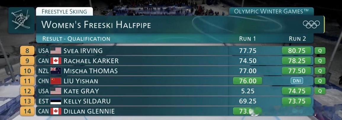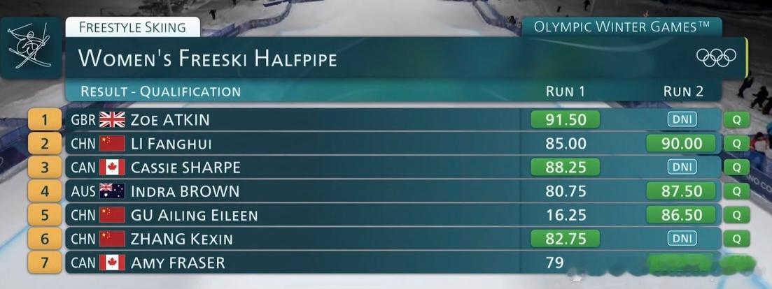 谷爱凌晋级U型场地决赛 自由式滑雪女子U型场地技巧预赛四位中国选手进入决赛✅No.2🇨🇳李方慧 90.00✅No.5🇨🇳谷爱凌 86.50✅No.6 🇨🇳张可欣 82.75✅No.11🇨🇳刘奕杉 76.00