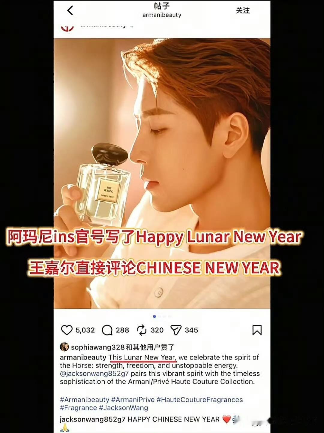 王嘉尔纠正阿玛尼官方 阿玛尼:在LunarNewYear这个团圆之际… 王嘉尔:用我照片请跟我说Chinese New Year