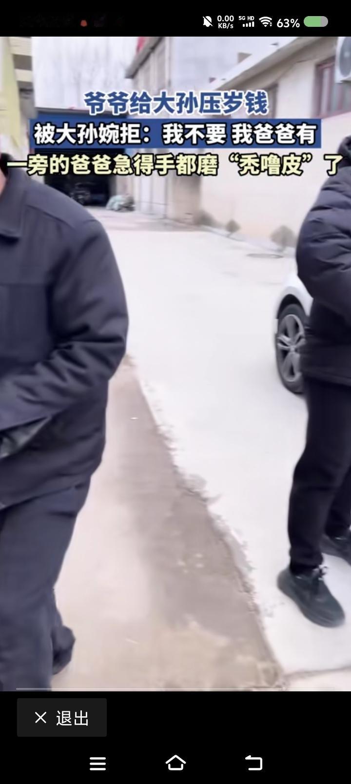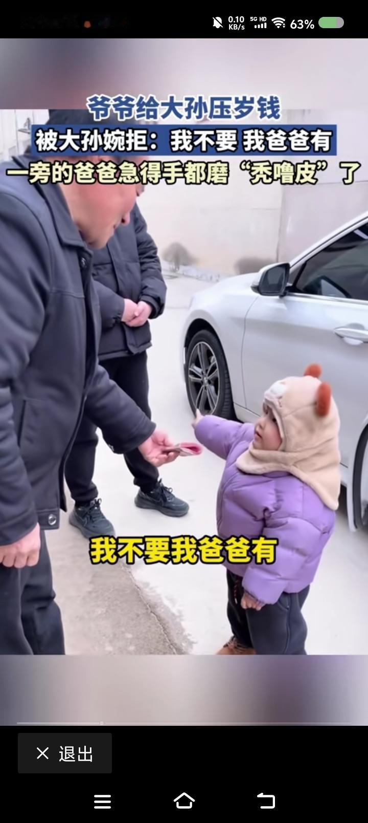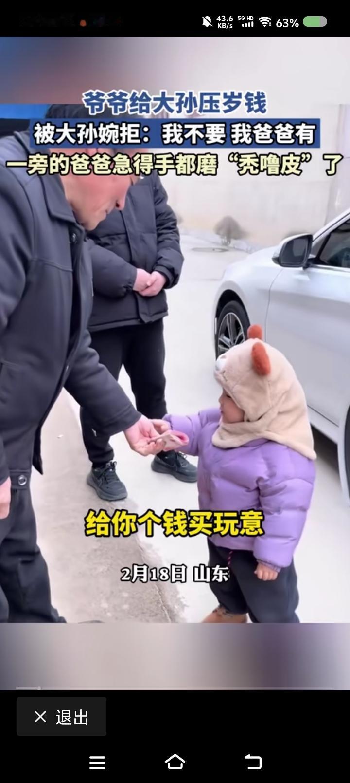 萌娃才是大丈夫—— 网上视频:过年期间,小孩和爸爸要回家了,爷爷要给孩子一沓钱,“给你,买你喜欢的。”小孩拒绝了:“我不要,我爸爸有。”爸爸又是给孩子使眼色,又是给孩子爷爷伸口袋。爷爷扭头走了。 点评: 萌娃才是大丈夫,富贵不能淫,对爷爷是纯纯的爱。小孩是不是一开始都不爱钱?反正我孩子小的时候,大人给压岁钱,她断然拒绝,大人塞她手里,她往回扔。 我小的时候,不想称呼亲戚,姑姨舅叔伯一概不叫。过年时候,他们老逗我:“叫伯伯,才给压岁钱,快叫。”我想起革命先烈,“这不是让我出卖尊严么?背叛革命,我做不到!”当然,他们肯定给父母了。但与我没什么关系了。直到上高中了,大伯家在县城,离学校近,接触多了,我才开始称呼亲戚了。 如今,亲戚一半左右不在世了。 亲戚中间的好多事我都有印象。整体而言,许多矛盾没有质量,都是认知导致的。我不能说他们的不是,只能说,他们与自己的父母、亲戚团圆,如何解释这一切的矛盾?面对生命的消逝,他们的恩怨能否消解?