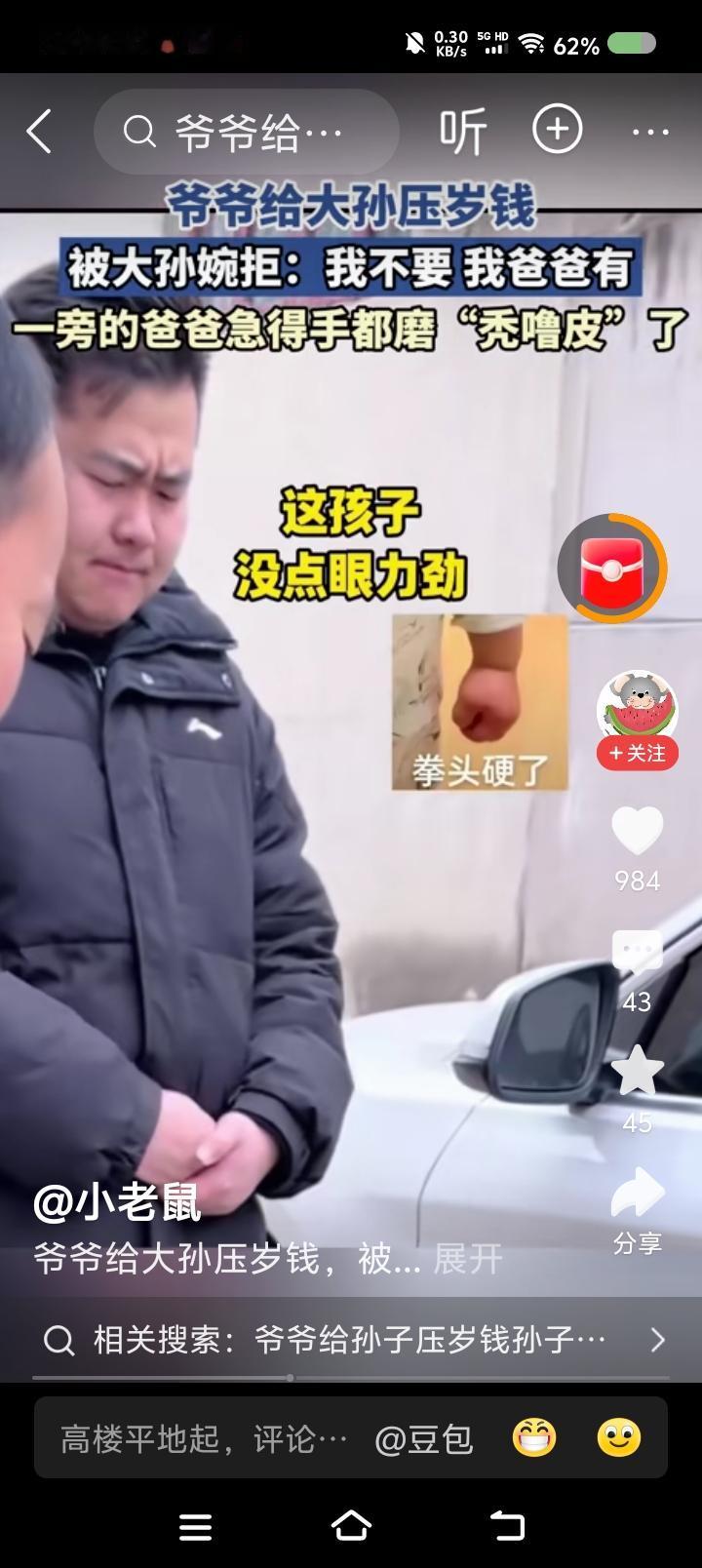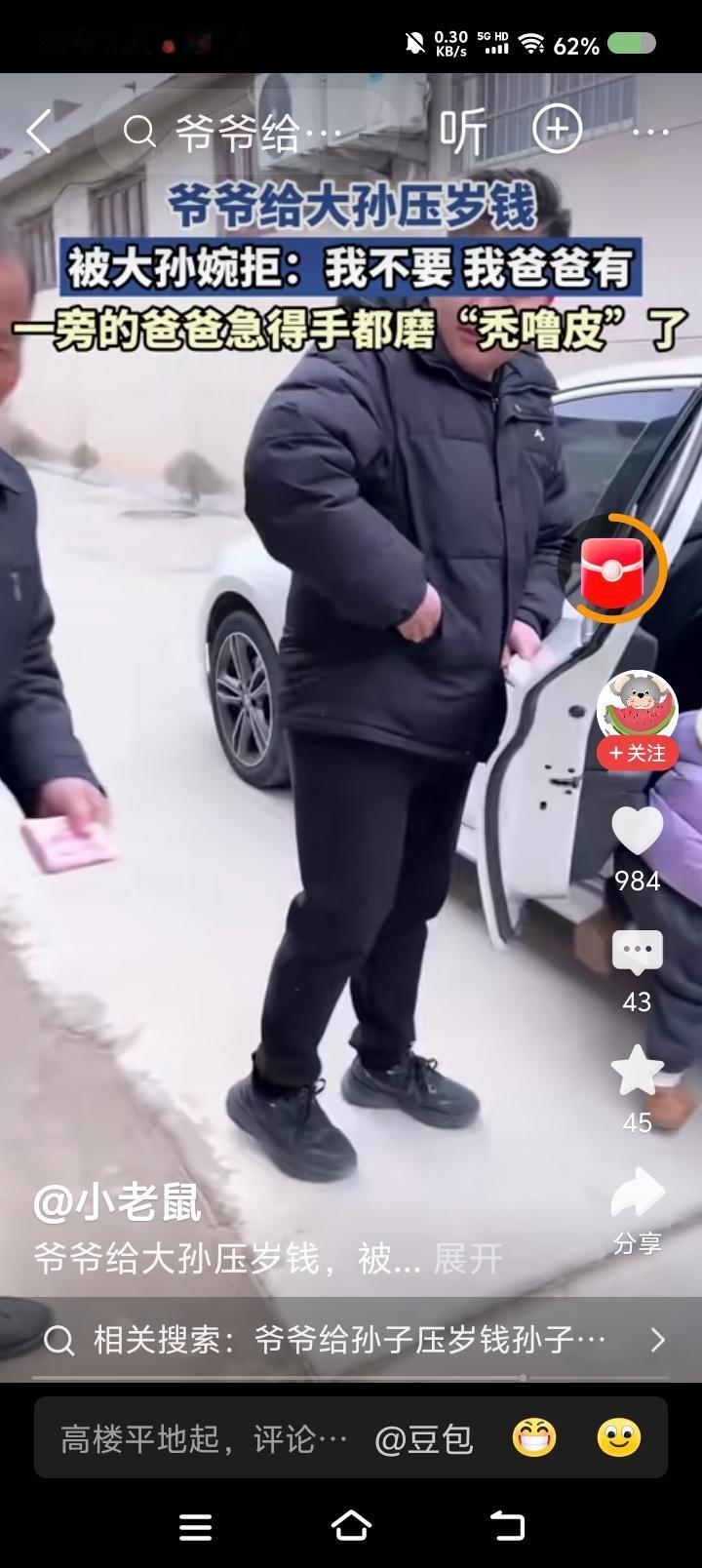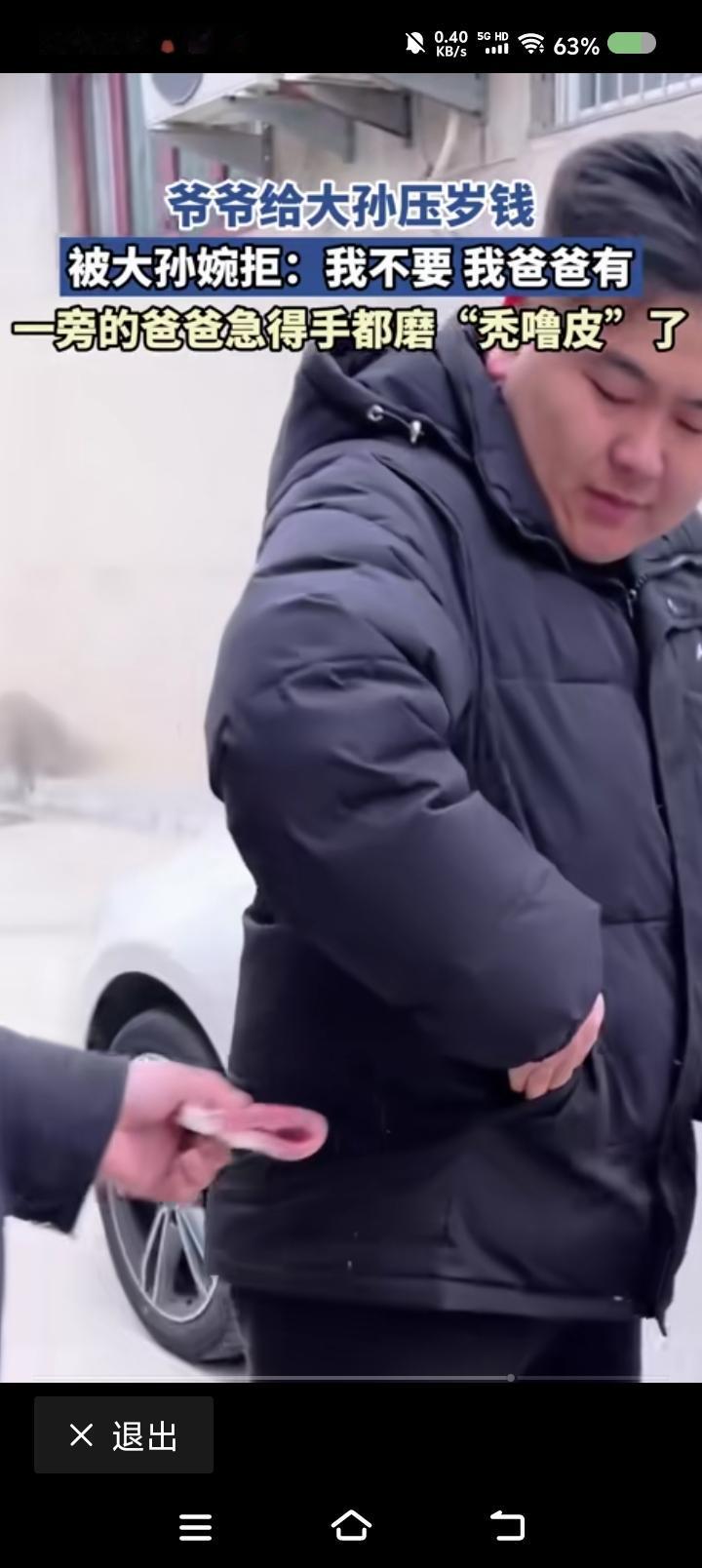 萌娃才是大丈夫—— 网上视频:过年期间,小孩和爸爸要回家了,爷爷要给孩子一沓钱,“给你,买你喜欢的。”小孩拒绝了:“我不要,我爸爸有。”爸爸又是给孩子使眼色,又是给孩子爷爷伸口袋。爷爷扭头走了。 点评: 萌娃才是大丈夫,富贵不能淫,对爷爷是纯纯的爱。小孩是不是一开始都不爱钱?反正我孩子小的时候,大人给压岁钱,她断然拒绝,大人塞她手里,她往回扔。 我小的时候,不想称呼亲戚,姑姨舅叔伯一概不叫。过年时候,他们老逗我:“叫伯伯,才给压岁钱,快叫。”我想起革命先烈,“这不是让我出卖尊严么?背叛革命,我做不到!”当然,他们肯定给父母了。但与我没什么关系了。直到上高中了,大伯家在县城,离学校近,接触多了,我才开始称呼亲戚了。 如今,亲戚一半左右不在世了。 亲戚中间的好多事我都有印象。整体而言,许多矛盾没有质量,都是认知导致的。我不能说他们的不是,只能说,他们与自己的父母、亲戚团圆,如何解释这一切的矛盾?面对生命的消逝,他们的恩怨能否消解?