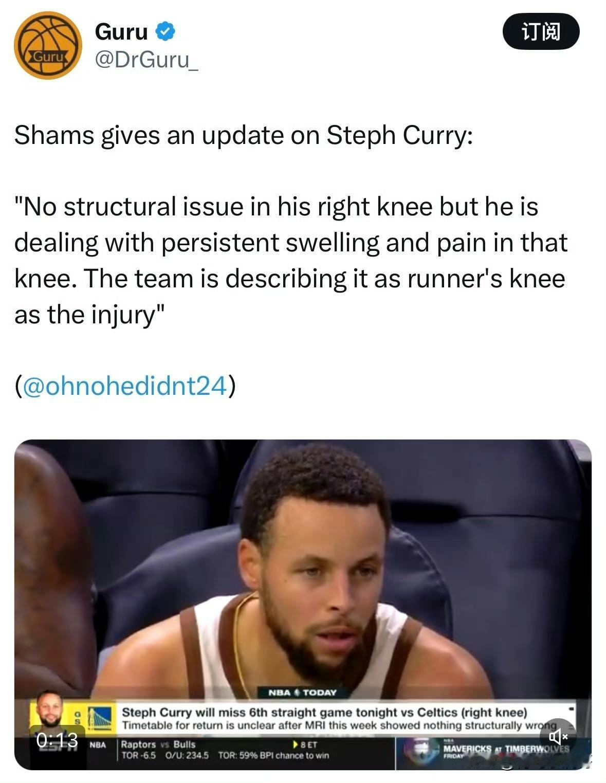别急!!!库里右膝确诊为跑步膝,复出时间成谜! 根据记者Shams最新消息透露