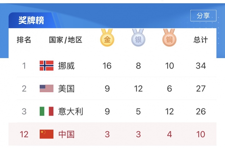 第12、13个比赛日,中国队2天内由苏翊鸣、徐梦桃、宁忠岩拿到3枚金牌,目前升至奖牌榜第12位。