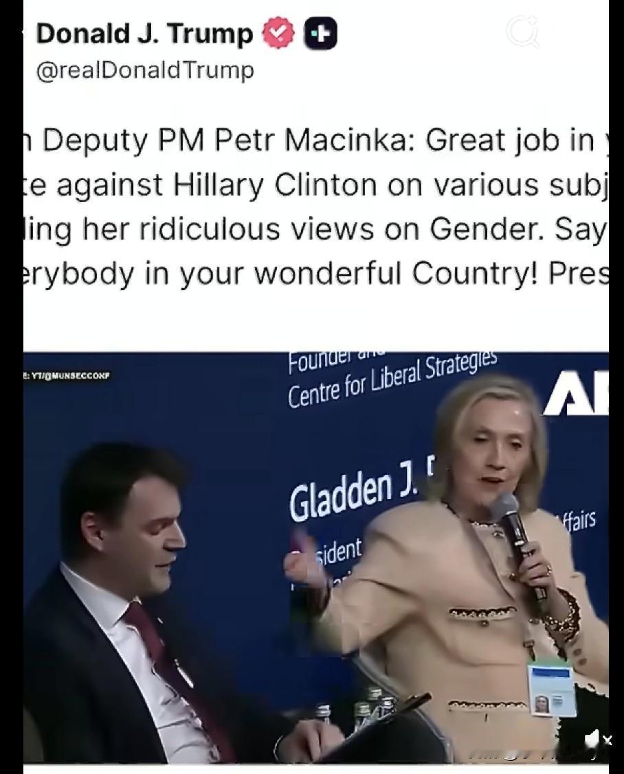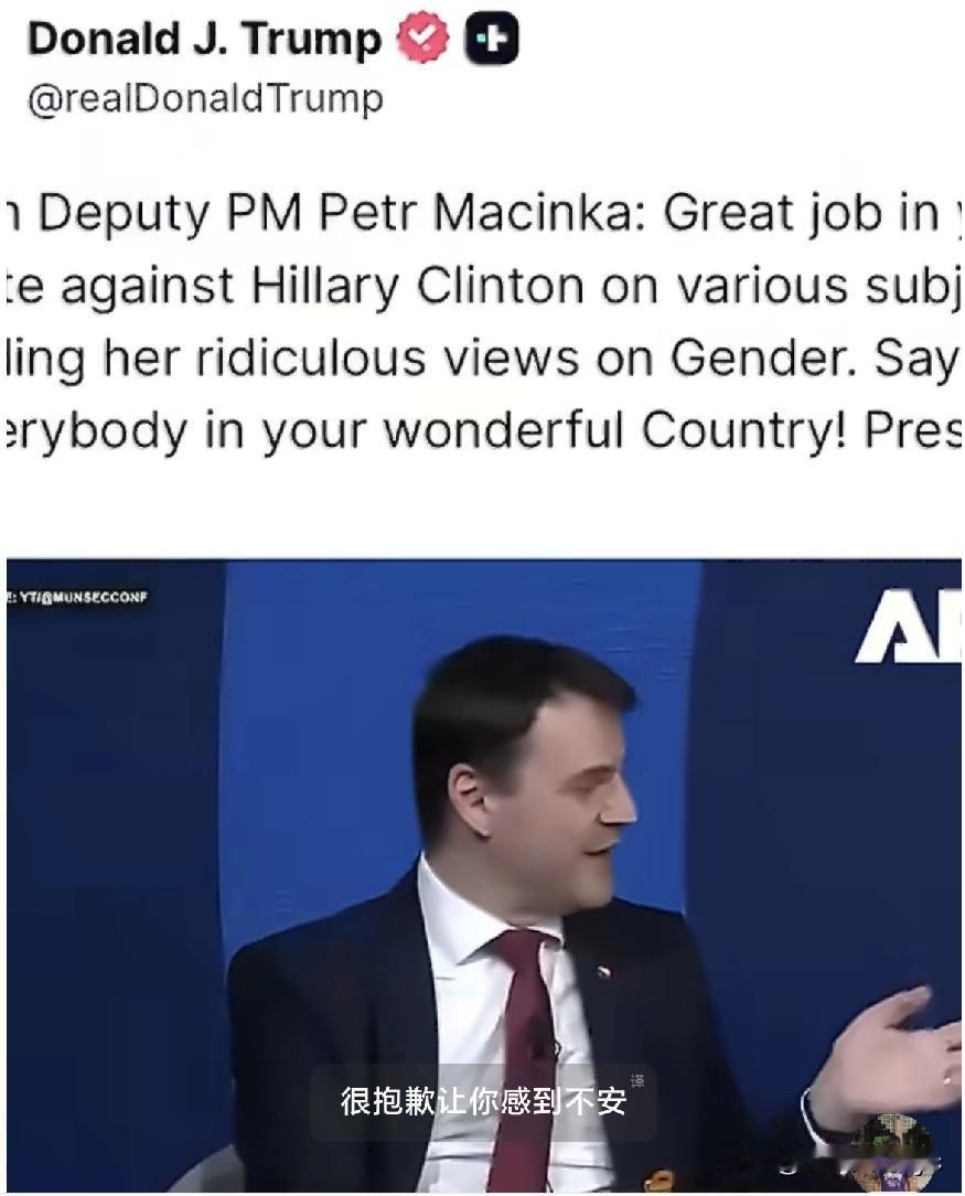特朗普发文赞扬捷克副总理彼得·马钦卡:你在与希拉里·克林顿的辩论中表现非常出色,涉及多个话题,包括她对性别问题的荒谬看法。向你们美丽国家的所有人问好! 特朗普确实在社交媒体上发文,高调赞扬了捷克副总理彼得·马钦卡。事情的起因是两人(马钦卡与希拉里)在慕尼黑安全会议上围绕特朗普政策及性别议题发生了激烈交锋,这段视频也在网络上 viral 传播。 这场争论发生在2月14日的慕尼黑安全会议一场小组讨论中。当时希拉里正猛烈抨击特朗普处理俄乌问题的方式,而马钦卡则挺身为其辩护,双方你来我往。 对话中,马钦卡批评了美国的“取消文化”和“觉醒运动”,并直言 “我不认同性别革命,我认为只有两种性别” 。希拉里则立即反问: “哪个性别革命?你是说女性拥有自己的权利吗?” 并质问道:“这是否就能成为抛弃那些正为自由而战、面临生死的乌克兰人民的理由?” 马钦卡的表现在国内引发了截然不同的声音: 右翼称赞,以特朗普为代表,赞扬他敢于挑战希拉里。 国内反对派则直言这是 “慕尼黑的尴尬” ,认为他的言论是在国际舞台上“丢脸”。 特朗普对此却高度赞扬,并向捷克人民问好。 此次交锋后,马钦卡于2月18日启程访美,计划以观察员身份参加特朗普设立的“和平委员会”首次会议。