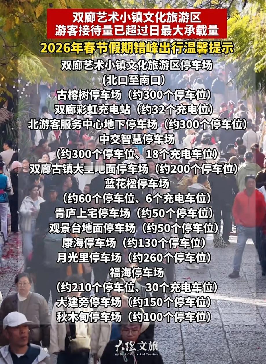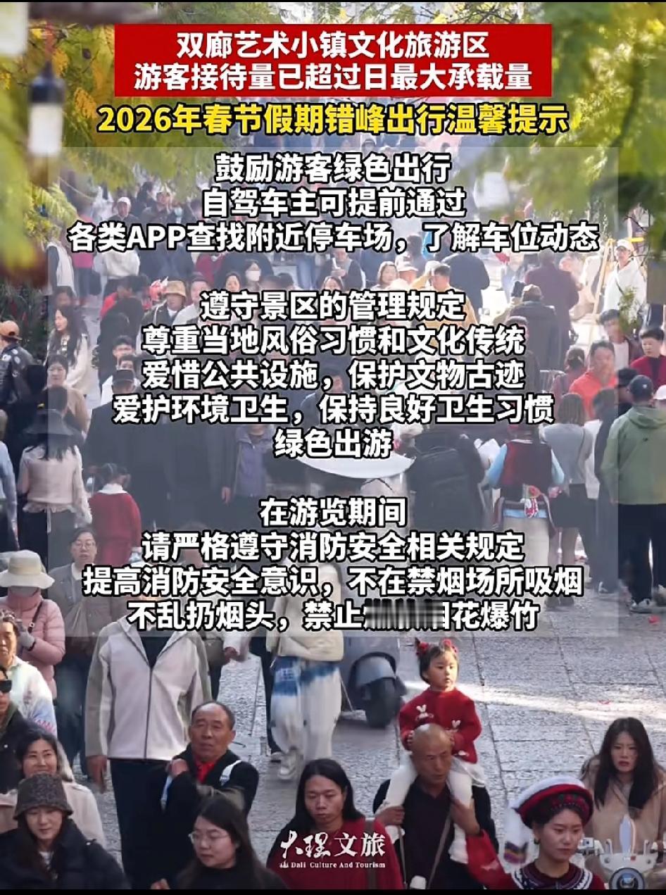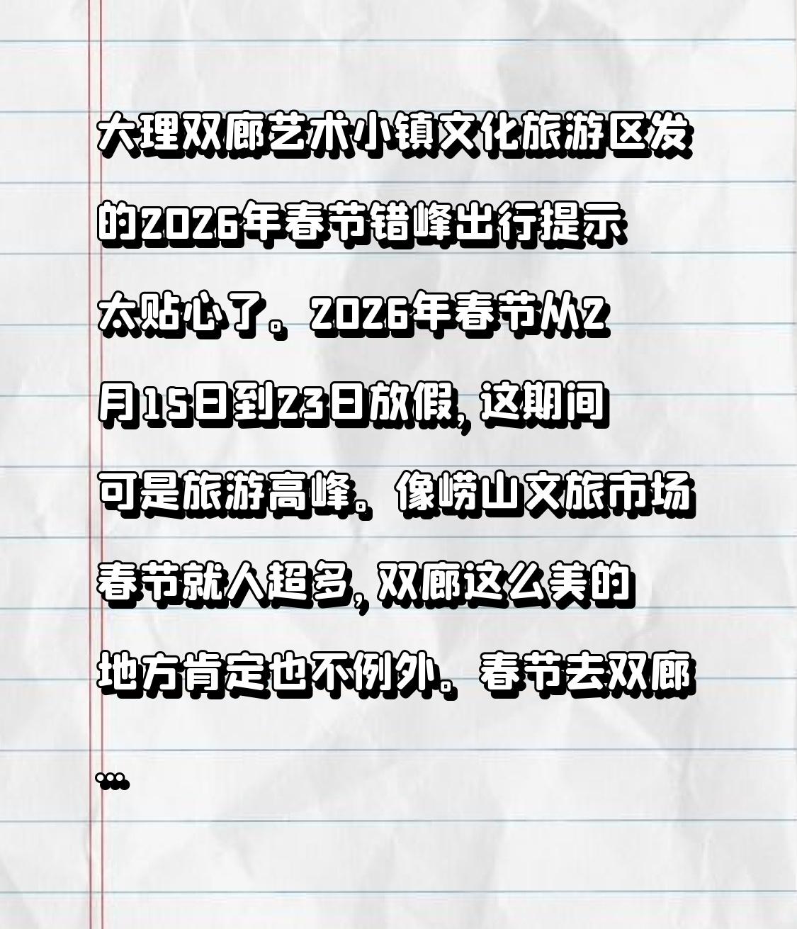 大理双廊艺术小镇文化旅游区发的2026年春节错峰出行提示太贴心了。 2026年春节从2月15日到23日放假,这期间可是旅游高峰。像崂山文旅市场春节就人超多,双廊这么美的地方肯定也不例外。 春节去双廊,要是赶上高峰期,体验感肯定大打折扣。不如听劝错峰出行,提前或推迟几天。既能避开人潮,又能好好欣赏洱海波光,感受小镇文艺气息。而且,出行前还得像崂山提示的那样,提前做好规划,严守交通安全。在大理过个悠闲又难忘的春节,不香吗?