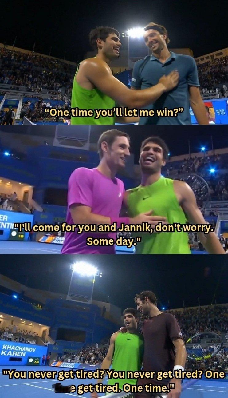 网坛风云 比起WTA赛后握手环节的Drama,ATP的这个环节就显得非常和谐,和前两轮一样,卡恰诺夫在赛后握手环节也问了阿卡一些问题,笑死。