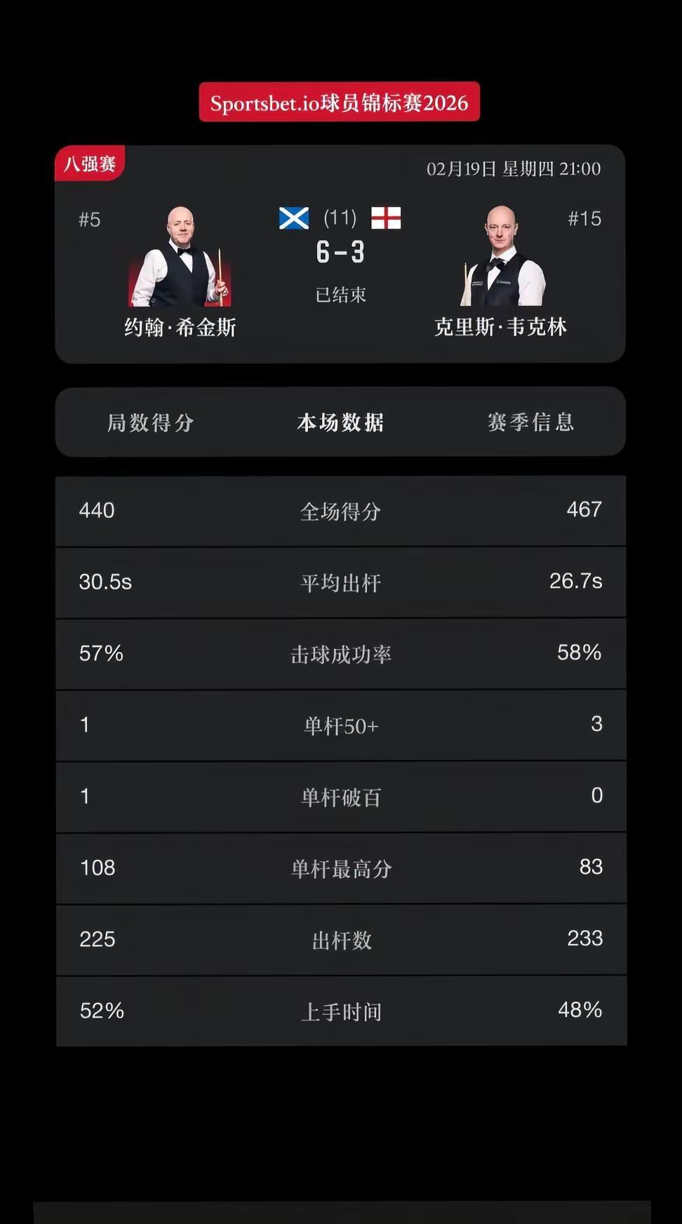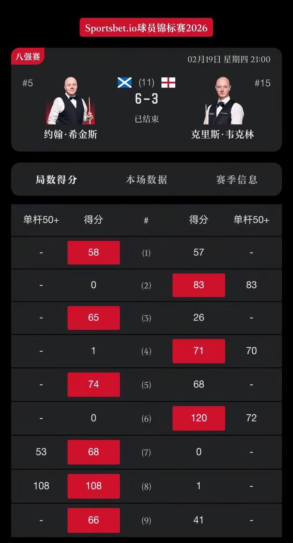 第14集|2026斯诺克球员锦标赛(排名赛)¼决赛8进4,21:00时段结束比分。约翰·希金斯6-3克里斯·韦克林 丁俊晖 赵心童 奥沙利文