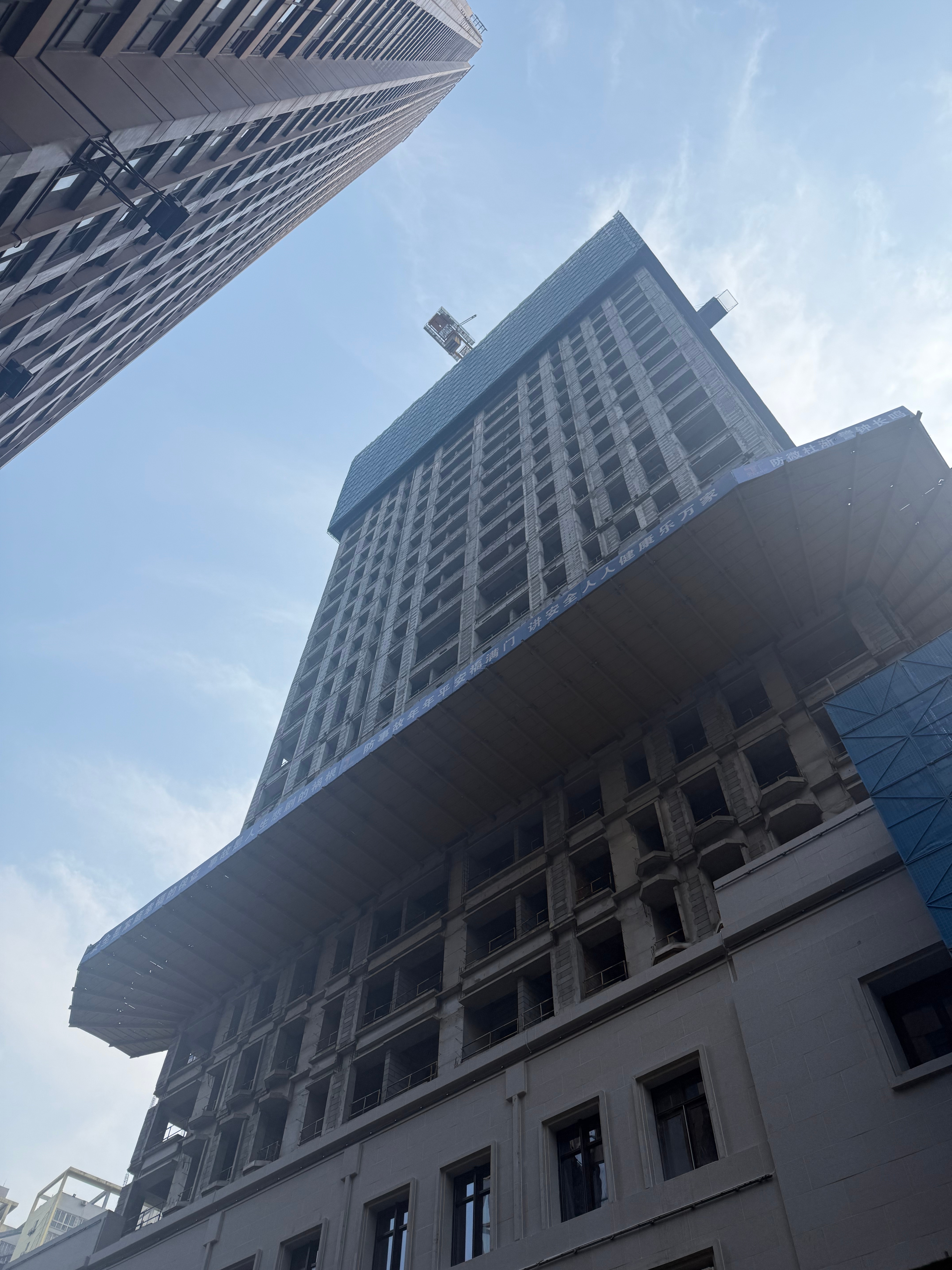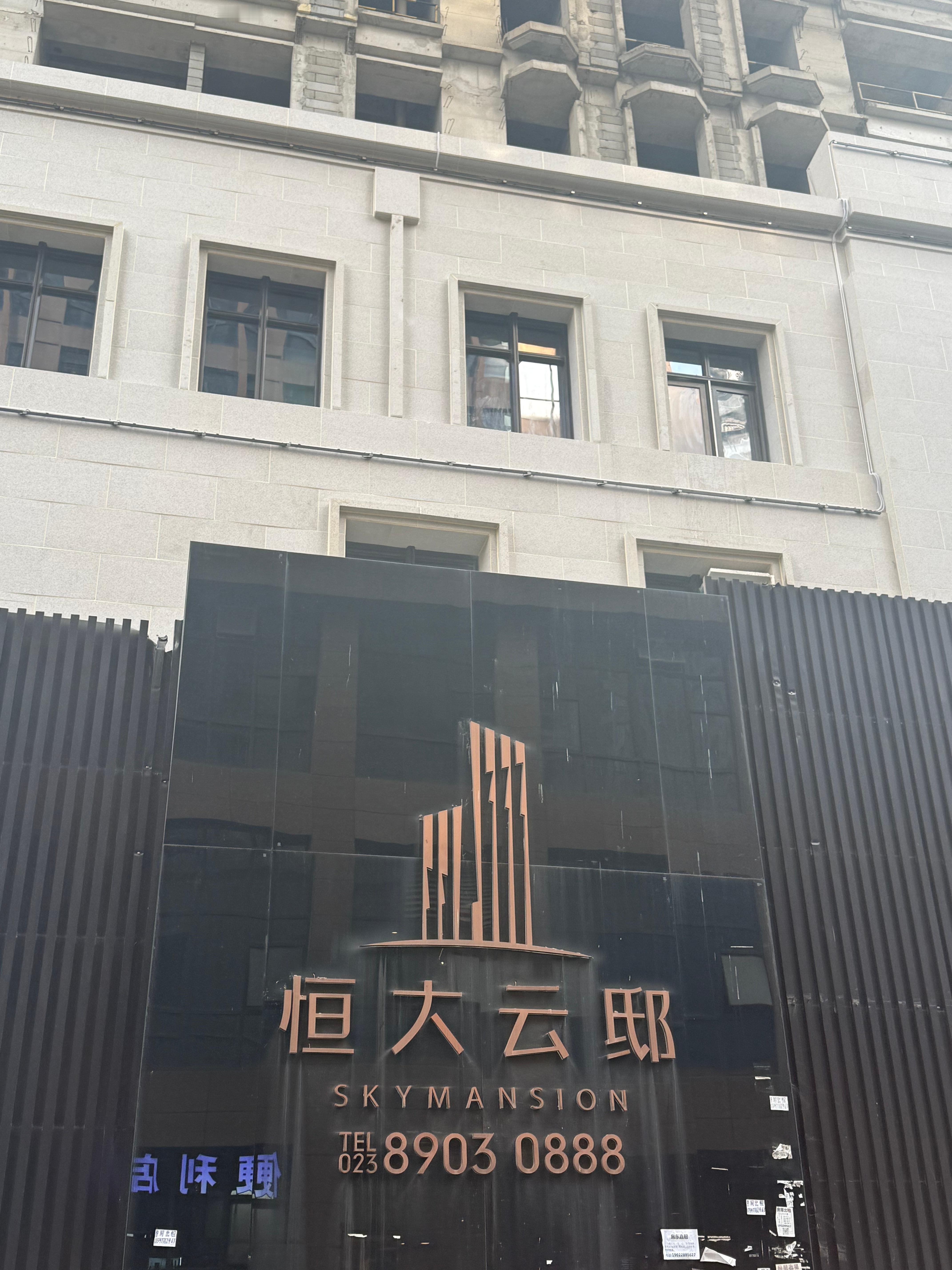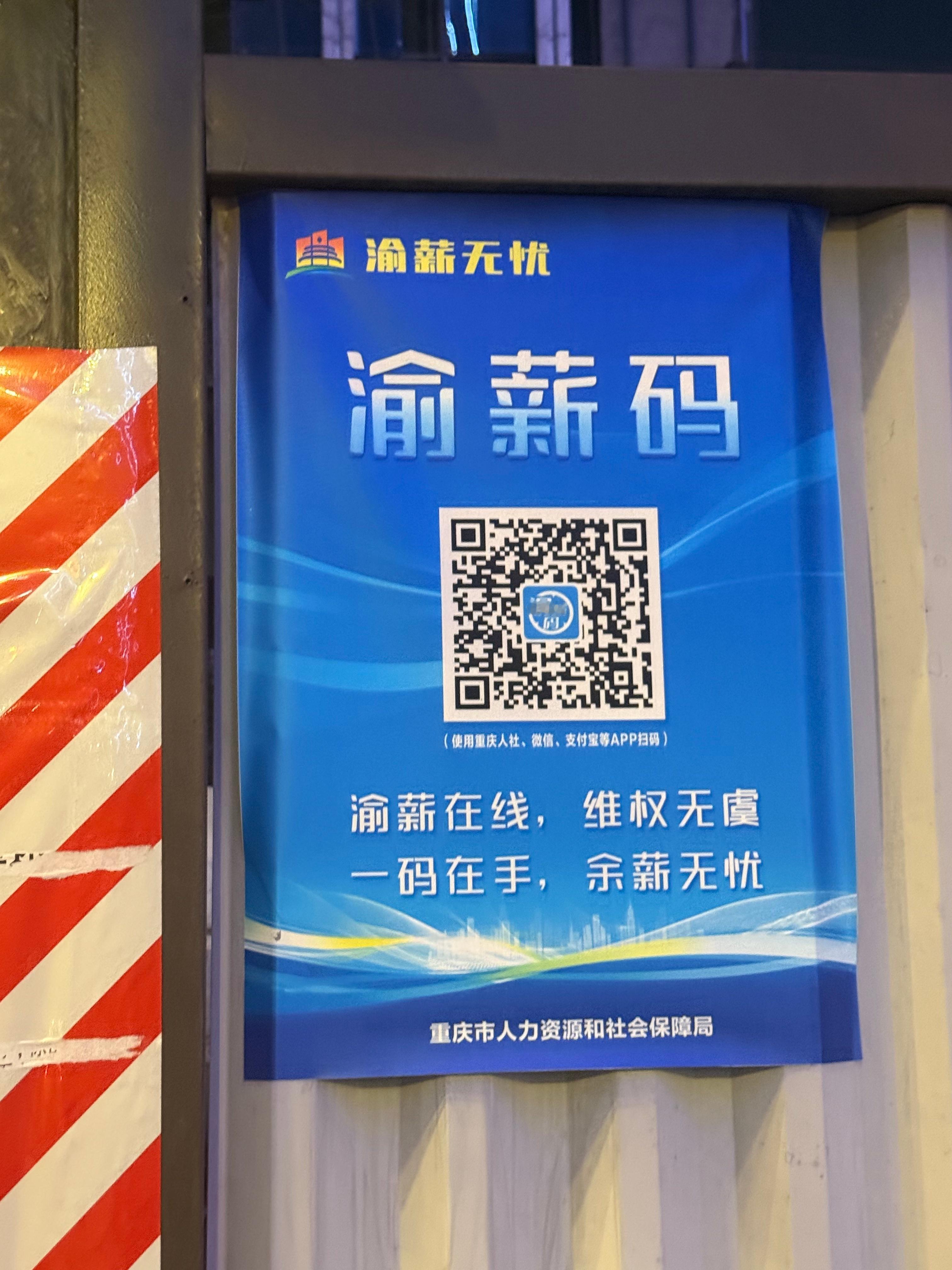 无独有偶,在一江之隔的渝中区,长江边的核心区赫然矗立着一栋高耸的烂尾楼——“恒大云邸”。嘉陵江边另一处停工工地的大门上,贴着人力资源与社会保障局的维权二维码——和远处的重庆城投以及重庆农村商业银行大楼遥遥相望。高大的烂尾楼和那枚“渝薪码”正如同土地财政时代的灰色钢筋混凝土墓碑和墓志铭,揭示着一切的代价。