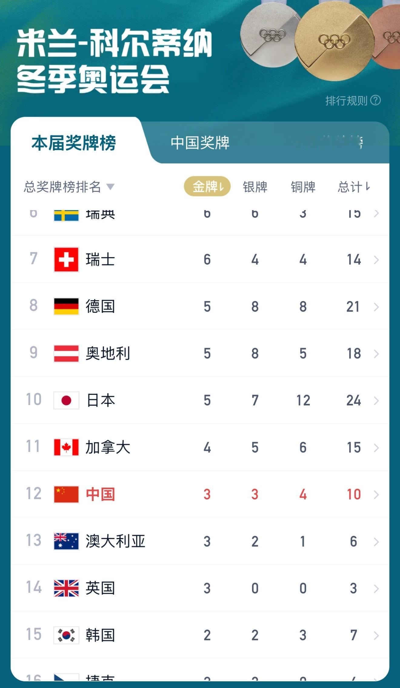 中国队升至冬奥奖牌榜第12 凭借宁忠岩的夺冠,中国体育代表团以3金、3银、4铜的成绩位列奖牌榜第12位。