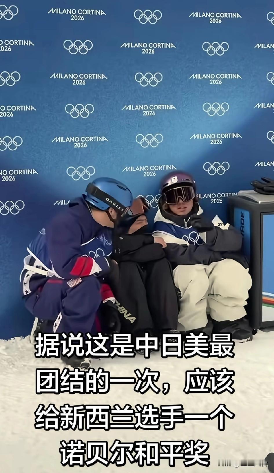 据说这是中日美最团结的一次,应该给新西兰选手一个诺贝尔和平奖!都期待他失误啊 哈哈,出成绩前三个小苦瓜,出成绩后三个向阳花。一个人的成全好过三个人的纠结!不失误就拿金牌结果失误了,因此蹲着的这三个都拿奖牌了,小苏拿了金牌。中国所有菩萨祖宗都出来帮忙了,苏既会说日语,也会说英语,沟通无障碍,这三个孩子应该会三国语言。