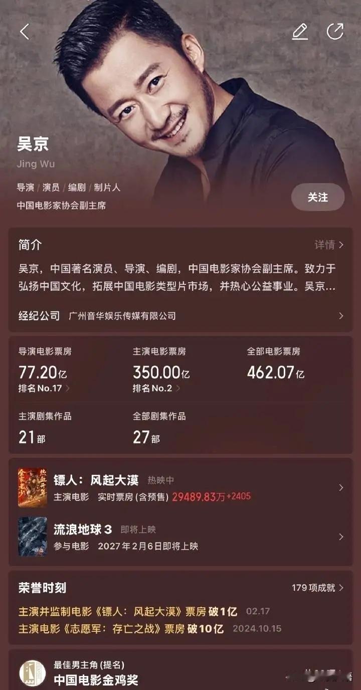 从武术冠军到百亿影帝,再到如今的350亿票房得主,吴京的每一步都走得扎实。他的成功不仅是个人的辉煌,更见证了中国电影的工业化进步,也证明了只有沉下心做作品,才能真正赢得市场和观众的认可。