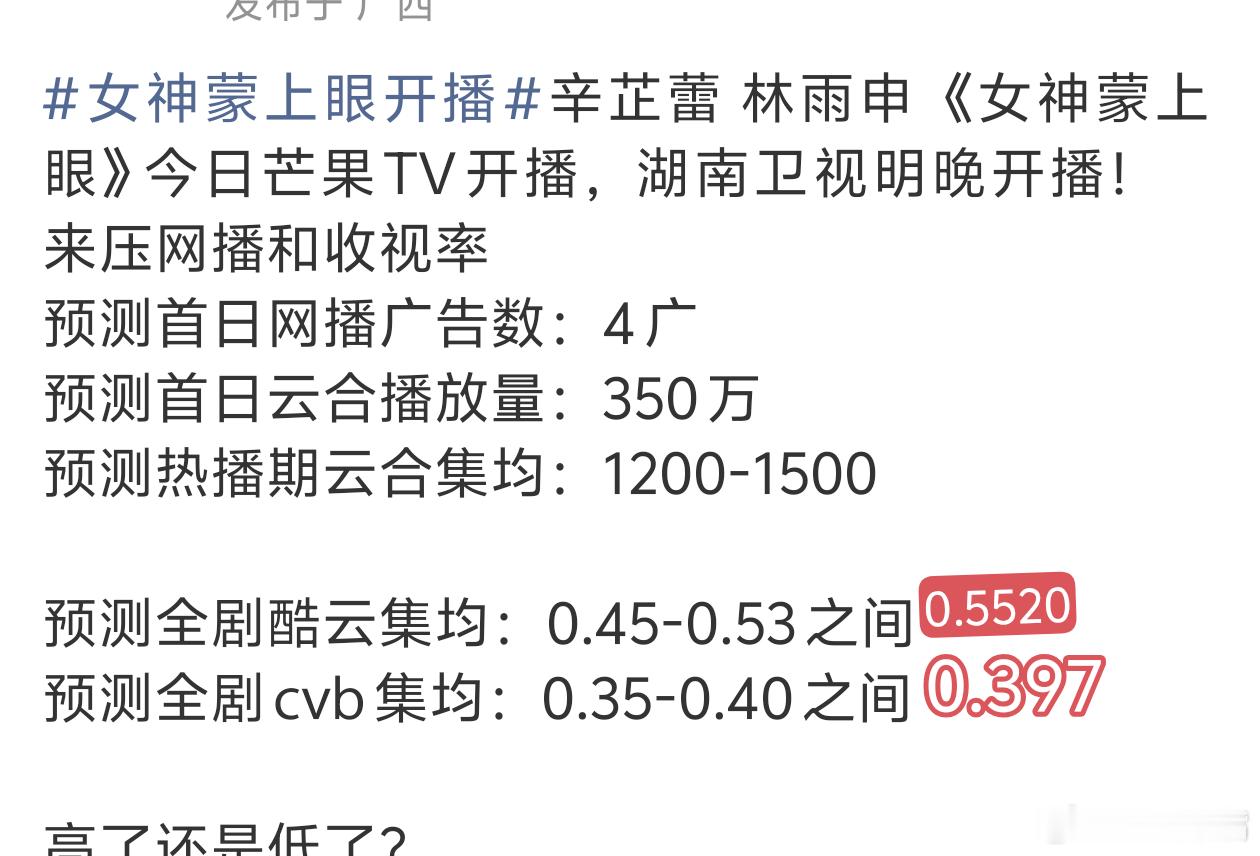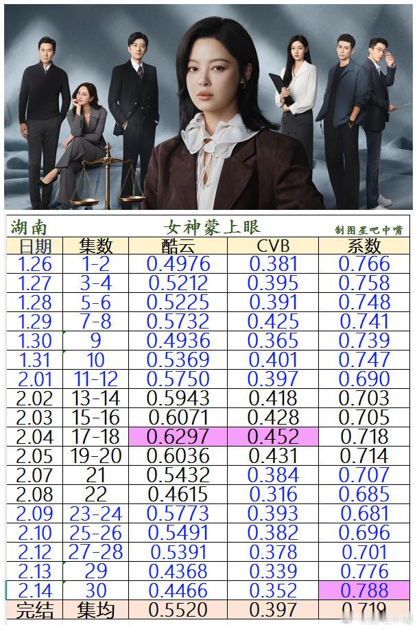 女神蒙上眼收视8连冠 辛芷蕾 林雨申《女神蒙上眼》湖南卫视收官战报酷云集均0.5520,暂列1/2CVB集均0.397, 暂列1/2虽然没有破0.4,但是也很不错了。