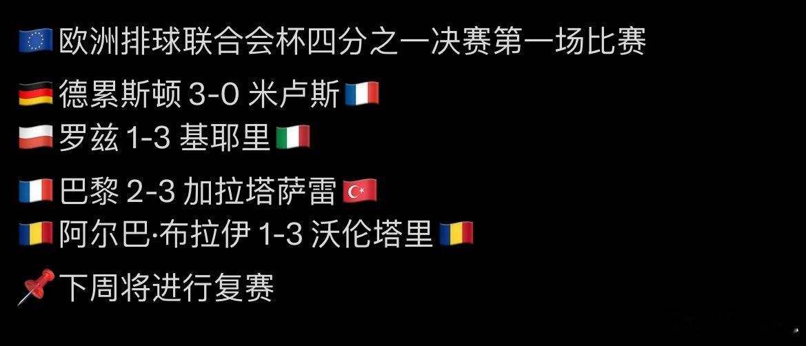 【欧联杯1/4决赛—加拉3-2险胜巴黎】欧联杯首回合1/4决赛结束世界女排新闻王媛媛 加盟的加拉塔萨雷3-2巴黎圣云🇫🇷;基耶里3-1罗兹建设🇵🇱德累斯顿3-0米卢斯🇫🇷🇷🇴沃伦塔里3-1布拉日🇷🇴