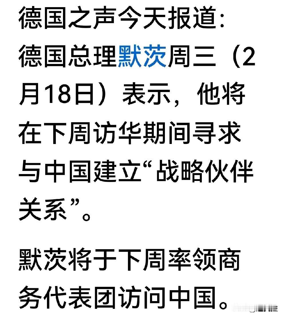 德国总理默茨表示,他将在访华期间寻求与中国建立战略伙伴关系。 对一个发达的工业化国家主动表示与中国建立战略伙伴关系应该说这个风向真的是彻底转变了。 因为德国的工业体系非常完整,德国的工业非常发达,德国的工业标准曾经是世界上其他发展中国家以及我们国家发展与其对标的。 现在看来,欧洲也好,德国也好,都在发展中遇到了新问题,那就是瓶颈问题。这个瓶颈对于德国来讲,由于俄乌冲突,它的能源、他的投资、它的基础设施更新、它的智能化建设都有问题。 而且外部面临着美国对欧洲的挤压,对德国的工业产品市场消耗。 如果说光是外交政治问题还不至于让一个国家的领导人低声下气唉声叹气,但如果说一个国家的经济发展停滞甚至倒退,那就意味着不光是政治外交的问题了,国内民生会出现重重困难。 前些年的难民问题,曾经冲击过德国的政坛,现在德国面临的几大重重困难迫使他必须向中国寻求互利共赢的策略,所以寻求发展战略性伙伴关系也是应有之义。对此我们当然欢迎。