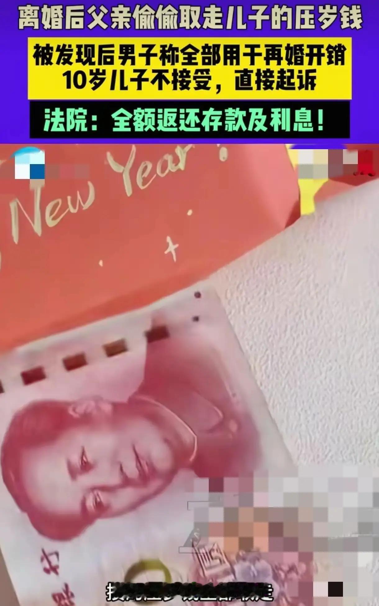表面上是儿子告爸爸,实际上背后还有其他大人,争的还是前家庭夫妻共同财产。夫妻离婚后才10岁的儿子判给父亲抚养,家庭财产分割时儿子压岁钱没分割。前妻看到儿子的压岁钱被前夫取走用于新家庭开支肯定不愿意,才10岁儿子怎么知道告爸爸的?想想就明白。