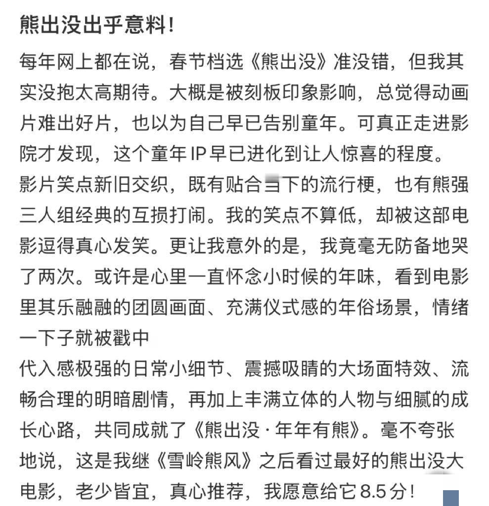 你跟我说这是熊出没今年春节档惊喜最大的非熊出没莫属了,以前只觉得熊出没是"带娃刚需",现在也完全可以是"视觉刚需"了,新的世界观架构每一帧都在烧钱啊!各种自然元素和开大对打完全就是顶级视觉盛宴,年关城的各种设计中式又时髦,异能的视效也让观众看得好满足。十二年经典老IP一直在卷一直在卷,现在能做到这种工业水准,可见其诚意和热情,国产动画真的有在悄悄起飞。