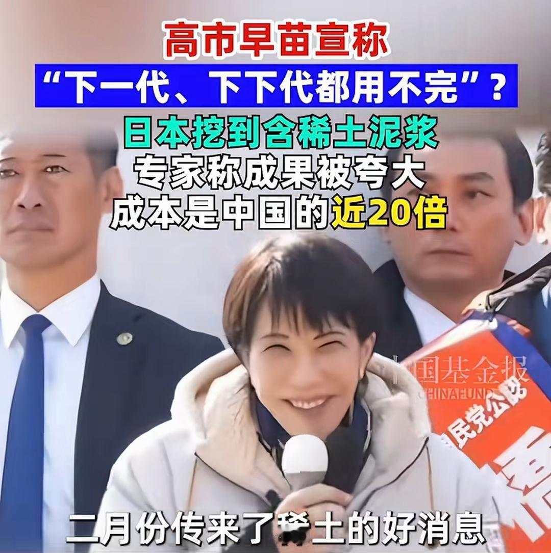 这大过年的,日本首相高市早苗也不闲着,跑到大街上给民众画大饼。 画什么饼?自然是画稀土饼。她站在台上笑容诡异,称:日本海底稀土取之不尽,下一代、下下代、下下下代都用不完,再也不用为稀土发愁了!直到现在,回想起她那张笑脸我都感到肝颤。 正当大家都以为日本这次真的要靠自己的能力摆脱稀土制裁时,万万没想到,打脸会来得那么快。 在随后接受采访的多位专家均表示:别听她忽悠,那泥浆里稀土含量很低,并且混杂着多种稀土元素,想要分离难度极大,缺了顶尖精炼技术根本就玩不转。就算是有技术,总成本是中国的近20倍,商业上完全是死局。 可人家高市早苗才不管这些,挖都挖上来了不能浪费,怎么着也得在政治上秀一波。为了稳选票硬撑面子,为了证明自己没错,把科考试采吹成产业胜利,真不知道,这番谎言还能遮多久? 中国不慌,手上握着全球90%以上稀土精炼产能,重稀土冶炼分离、串级萃取、高纯提纯形成不可复制的全链壁垒,慢慢看着你表演呗。 我不相信,一个近乎100%依赖中国的国家。能一夜之间玩出花来。深海6000米开采、运输、脱水、分离、提纯,每一步都是天价成本,日本连中试都没跑通,更不用提量产平价。 看着吧,要不了多久,日本只会哭着回头来求中国。因为高端制造、军工、新能源都缺不了稀土,没有中国的成本和技术,日本的产业链寸步难行。 最后做个总结:靠谎言只能一时维稳,但终会被现实反噬。最后的结局一定是日本认输,重新求购中国稀土。
