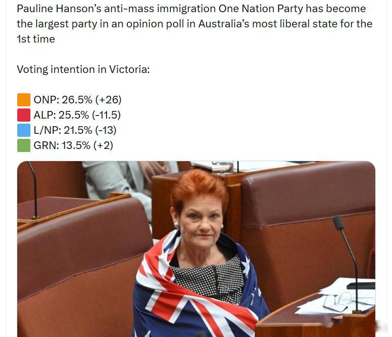 宝琳·汉森领导的反大规模移民政党“一国党”(One Nation Party)首次在澳大利亚最自由派的州——维多利亚州——的民意调查中成为最大政党。