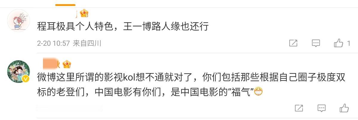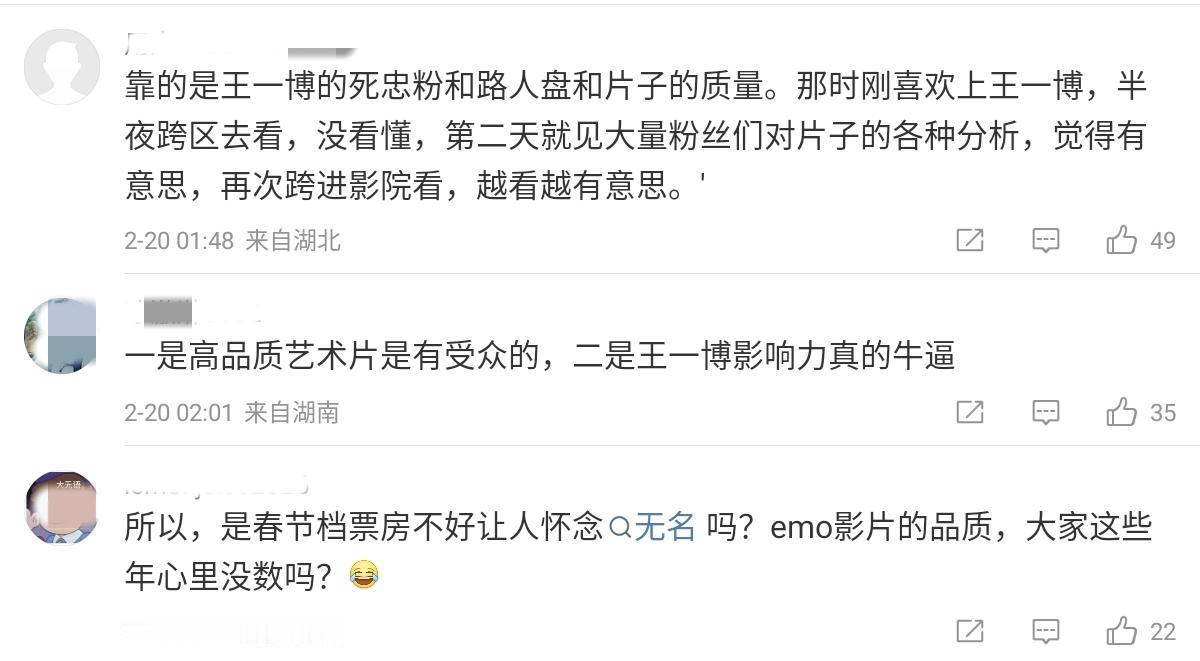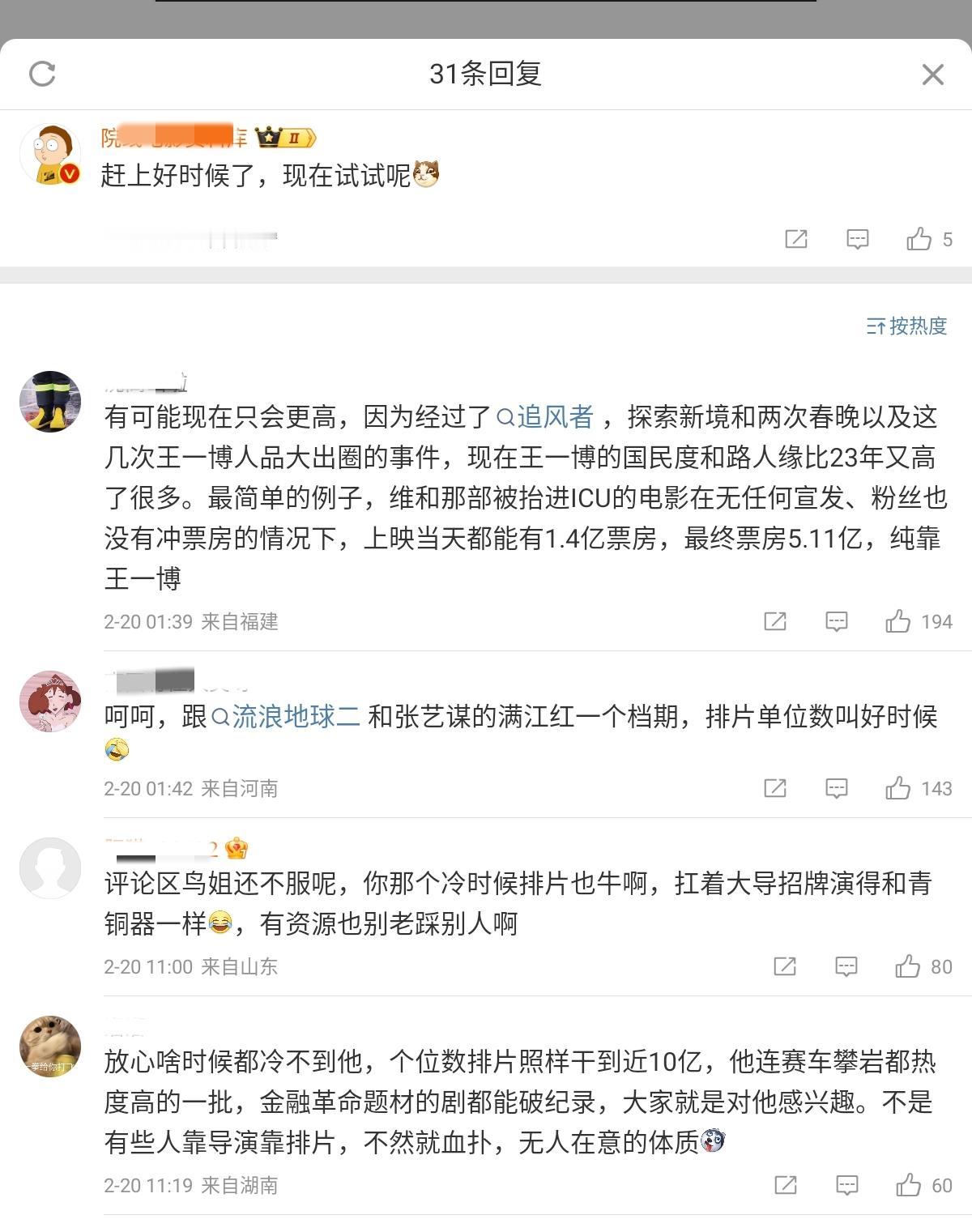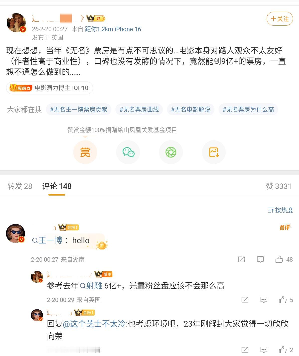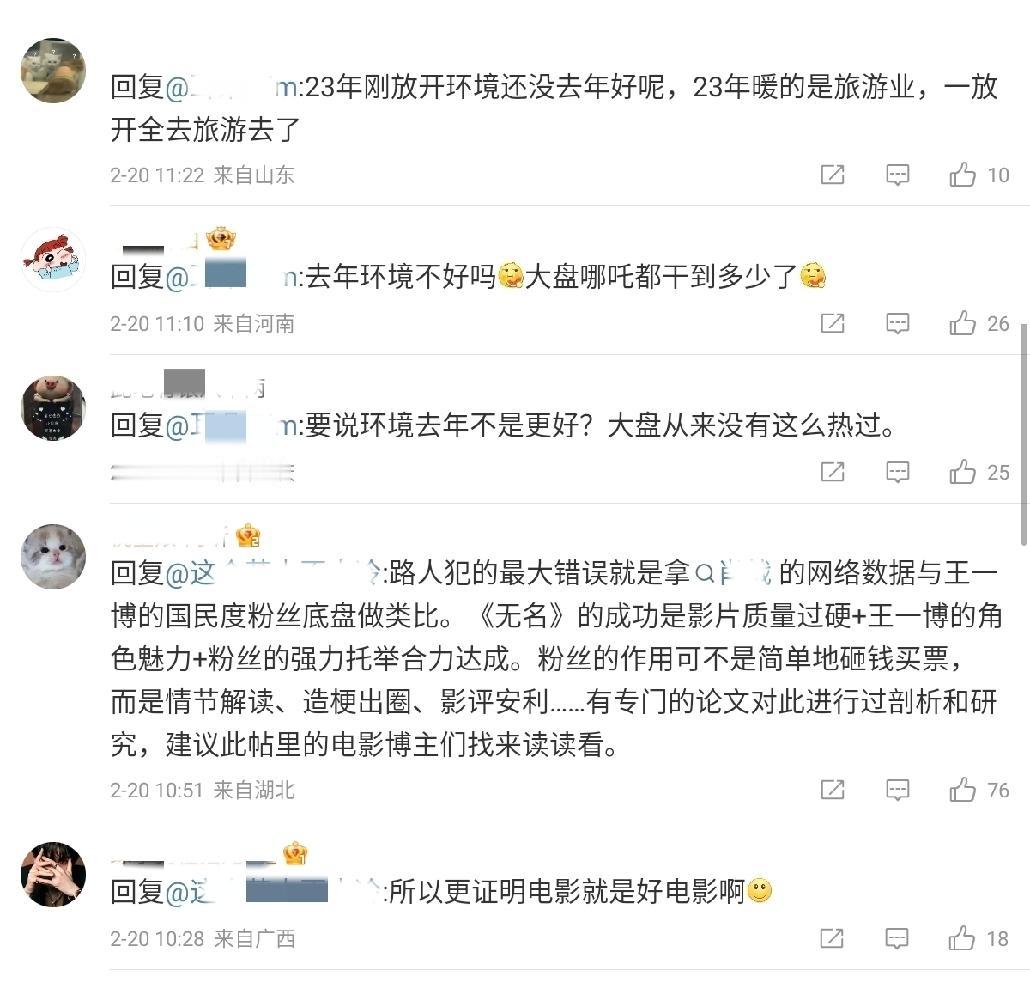 今年春节档不太景气,电影博主们又忆当年了。三年了它们仍然觉得无名不可思议,试图用赶上好时候和放到现在来试试来模糊影片的品质,不愿意承认王一博是无名的最大变量这个事实。不过评论区路人很会怼。[大笑] 内娱真的愿意无名放到今年春节档吗?啧啧,就王一博春晚舞台这个火爆程度,大年三十当晚多少人看完节目就会立马去买电影票哦。 王一博微指连续四天破亿,大年初一比前一晚的微指还要翻倍,舞台后劲冲天。 初一冲去影院的那一波观众发现妈耶,大银幕上的叶先生跟春晚那个舞王完全不同的帅[大金牙]。都不敢想象那口碑发酵的速度会有多快了! 必须要不厌其烦地经常宣传无名的战绩,省得内娱岁月史书混淆视听: 👉🏻《无名》就是典型的口碑发酵。 👉🏻《无名》盈利!博纳上市公司公告盈利1.19亿元,毛利率46.12%(未包括其它出品方盈利)。过了六亿票房后导演就公开说盈利了。 👉🏻《无名》赢的最大变量就是王一博!导演和其它演员的演技是影片品质的保证,但是不足以带来高票房。唯一让市场意料不到的是电影新人王一博,一想不到他演得那么出彩,二想不到他粉丝盘那么大,三是 想不到他路人缘这么好。