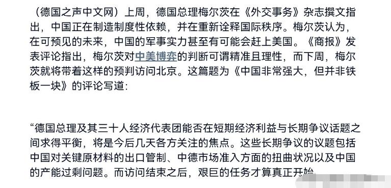 德媒表示,德国总理的北京之行非常的棘手,德国不能接受中国主导的国际秩序!2月20日,德国之声刊文表示,梅尔茨的此次北京之行之所以受到高度关注,是因为他既不能无视德国当前的经济利益,也不能忽略欧洲长远的战略风险。梅尔茨北京之行的棘手之处在于,德国经济高度依赖中国,但德国又无法接受由中国主导国际秩序。 德媒表示,中国的确很强大,并在努力成为科技和工业的主导力量。但中国需要欧洲的迫切程度,绝不亚于欧洲需要中国的程度。德媒表示,德国要做的就是必须承担必要的经济代价,降低对中国的依赖,以确保长期的政治行动力。访问结束之后,艰巨的任务才算真正开始。 其实说白了,梅尔茨这次来北京,就是带着“两难选择题”来的——一边是德国当下离不开的中国市场,一边是欧洲某些势力渲染的“战略风险”,怎么选都怕吃亏,这才是所谓“棘手”的核心。 德媒的这番表态,看似客观分析,实则藏着欧洲政客的普遍焦虑:既想从中国的发展中分一杯羹,又不愿放下身段接受中国崛起的现实,更不甘心失去过去由西方主导的国际话语权。 就说德国对中国的经济依赖,这可不是德媒随口一提,而是有实打实的数据支撑。作为德国经济的支柱产业,汽车、化工、机械制造等领域,对中国市场的依赖度高到难以想象。 就拿汽车行业来说,中国是德国汽车最大的海外市场,大众、宝马、奔驰等巨头,在华销量常年占据其全球销量的三分之一以上,甚至部分车型的在华销量超过一半。 除此之外,德国的化工产品、工业设备,也大量出口到中国,中国市场的波动,直接影响着德国企业的营收和德国国内的就业岗位。 也正因为如此,梅尔茨此次访华,根本不可能真的摆出“强硬脱钩”的姿态。要知道,当下德国经济正处于复苏乏力的状态,通胀压力未减,工业产出增速放缓,要是真的贸然降低对华依赖,首当其冲的就是德国本土企业,大量的订单流失、工厂减产,最终只会让本就疲软的经济雪上加霜,这是梅尔茨政府万万不敢承担的后果。 但另一方面,德国又被“西方阵营”的战略思维绑架,加上自身对“国际秩序主导权”的执念,才会喊出“不能接受中国主导国际秩序”的口号。 德媒口中的“中国努力成为科技和工业的主导力量”,本质上是对中国发展的正视,但后面紧跟的“中国需要欧洲不亚于欧洲需要中国”,就多少有些自我高估了。 中德之间的合作,从来都是双向共赢,而非单方面的“依赖”。中国需要德国的先进技术和高端制造经验,助力自身产业升级;而德国需要中国的庞大市场和产业链优势,维持其经济活力。 但随着中国科技和工业的不断发展,我们已经逐渐摆脱了对西方技术的单一依赖,形成了自主可控的产业链体系,反倒是德国等欧洲国家,在很多领域越来越离不开中国的供应链和消费市场。 德媒刻意强调“双方相互需要”,其实是想掩盖德国对中国依赖更深的现实,给自己找一个“平等对话”的心理平衡。 至于德媒建议德国“承担经济代价,降低对华依赖”,更是听起来美好,实则难以落地。降低依赖不是一句口号,需要有替代市场、替代产业链作为支撑,但目前来看,全球范围内,没有任何一个市场能像中国这样,兼具规模大、潜力足、产业链完整的优势;也没有任何一个国家,能像中国这样,为德国企业提供稳定的发展环境和广阔的增长空间。 贸然降低对华依赖,只会让德国企业失去竞争力,让德国经济陷入更大的困境,所谓的“确保长期政治行动力”,不过是自欺欺人的借口。 梅尔茨此次北京之行,与其说是“解决问题”,不如说是“传递态度”——既想向中国示好,争取更多经济合作机会,又想向欧洲盟友表态,不会“纵容”中国的发展。 但这种左右摇摆的态度,恰恰反映出德国当前的战略迷茫:在全球化浪潮下,试图在经济利益和政治执念之间找平衡,最终很可能两边都落空。 说到底,国际秩序从来都不是某一个国家能单独主导的,而是由世界各国共同参与、共同构建的。中国一直倡导的是多边主义,主张各国平等相待、互利共赢,这与德国等欧洲国家追求的“国际秩序”,本质上并不冲突,冲突的只是西方长期以来的霸权思维和主导执念。 梅尔茨访华结束后,真正艰巨的任务,从来都不是“降低对华依赖”,而是德国能否放下执念,正视中国的发展,接受多极化趋势,真正以平等的姿态,与中国开展务实合作。 毕竟,在当下的全球经济环境中,合作共赢才是唯一的出路,逆势而为、刻意脱钩,最终只会搬起石头砸自己的脚。