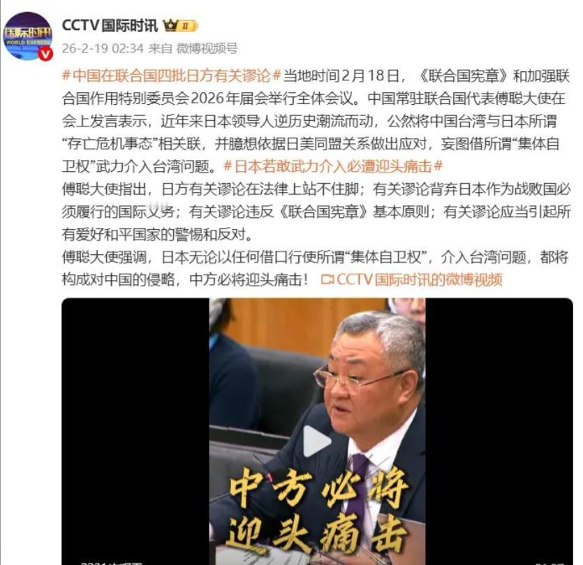 真过瘾,没有外交辞令,免得日本听不懂:敢掺和台湾事,灭了你!中国常驻联合国大使傅聪义正词严警告日本:“日本无论以任何借口行使所谓“集体自卫权”,介入台湾问题,都将构成对中国的侵略,中方必将迎头痛击!” 原话,一字不差,有史以来说得最清楚明白的一句话,这么大的外交官没有使用一句一字的外交语言,直截了当,免得日本政客又说自己没听懂,然后模糊话题。这几句掷地有声,小学生都听得懂。迎头痛击已经是克制,没直接说“灭国”已经给日本面子了。 傅聪大使这席话之所以听得人解气,核心就是戳破了日本的伪装,把话说到了根上,不玩虚的不绕弯,就是怕日本政客揣着明白装糊涂。 日本这些年在台湾问题上的小动作不断,嘴上喊着遵守一个中国原则,实际却在一步步试探红线,所谓“集体自卫权”不过是包装侵略野心的遮羞布。 先把这个“集体自卫权”的底说透,这东西根本不适用于台湾问题。按国际法规定,集体自卫权是主权国家之间的事,得是两个主权国家结盟,一方遭攻击另一方才能帮忙。可台湾是中国的一部分,不是什么主权国家,连行使这个权利的前提都不存在。 日本拿这个当借口,本质就是想把台湾从中国分裂出去,变相承认“台独”势力,这是明晃晃地违背国际法,也违背了《中日联合声明》里的承诺。 更可笑的是,日本自己的和平宪法本来就规定了“专守防卫”,只能在本土遭攻击时自卫,就算2014年解禁了集体自卫权,也要求满足“威胁日本存亡”的严苛条件,中国解决自己的内政问题,怎么可能威胁到日本的存亡?纯粹是无稽之谈。 日本之所以敢这么跳,说白了就是打地缘政治的算盘,想借着美国的势力遏制中国,同时实现自己的军事扩张。 这些年日台勾连越来越公开,搞所谓“党派2+2会谈”都已经举行了6次,表面谈半导体合作、海巡协作,实际就是在搭建“准官方”的联系,朝着“日台安保一体化”使劲。 更过分的是,日本政客还喊出“台湾有事就是日本有事”,把台湾问题和日美同盟绑在一起,这根本就是在破坏地区和平,重走军国主义的老路。 要知道,二战后《开罗宣言》《波茨坦公告》早就明确了台湾是中国领土,日本作为战败国,本来就有义务尊重这个事实,现在却反过来想插手,完全是背弃了自己的国际义务。 再看日本政府的操作,一边说遵守中日四个政治文件,一边又出具答辩书说《中日联合声明》“不具备法律约束力”,允许地方议员随便赴台活动。 这种自相矛盾的做法,就是想模糊立场,既想从对华合作中捞好处,又想在台湾问题上给自己留余地。 之前日本政客就总爱用模糊的表态打擦边球,事后又说“没听懂”“有误解”,这次傅聪大使直接把话挑明,定性为“侵略”,表态“必将迎头痛击”,就是断了他们这种耍滑头的可能。 这话不用翻译,不用解读,不管是日本政客还是普通民众,都能清楚知道底线在哪,再敢越界就要付出代价。 很多人觉得“迎头痛击”已经够硬了,其实这已经是中方的克制。中国从来不想主动挑起冲突,但在主权问题上没有任何妥协的空间。 从实力对比来看,中日之间早就不是一个量级,中国海军舰艇总数是日本的好几倍,总吨位是日本的3倍,3艘航母形成作战体系,火箭军的常规导弹能覆盖日本全境的军事基地。 日本虽然军费连续14年增长,2026财年预算都到8.84万亿日元,但武器装备依赖美国,没有独立的作战体系,真要动手根本没有胜算。 而且中方的反制也不止军事层面,之前实施的两用物项出口管制,切断了稀土、特种合金这些关键材料的供应,直接影响日本军工企业的生产,民间层面赴日旅游人次下降,经济压力也让日本扛不住。 更重要的是,国际社会都清楚台湾问题的本质是中国内政。联合国2758号决议奠定了一个中国原则的国际法基础,182个与中国建交的国家都恪守这一原则。 日本想拉美国、搞同盟来插手,可在慕尼黑安全会议上,中国外长点名批评日本后,西方各国代表都选择了沉默,美国没表态支持,北约也回避亚太议题,根本没人愿意为日本的错误行径背书。这说明日本的图谋根本不得人心,违背了全球和平发展的潮流。 日本忘了自己的历史教训,当年就是以“保护侨民”为名发动侵略,制造了济南惨案、一·二八事变等无数惨案,现在又想拿类似的借口插手台湾问题,这是在触碰亚洲受害国人民的底线。 而中国早已不是过去的中国,有决心更有能力捍卫国家主权和领土完整。傅聪大使的表态,不是威胁而是警告,是告诉日本不要低估中国的决心,不要在错误的道路上越走越远。 所谓“迎头痛击”,不是一句空话,是中方基于法理、历史和实力的坚定立场,日本如果真敢迈出那一步,等待它的只会是彻底的失败,到时候可就不是“给面子”那么简单了。