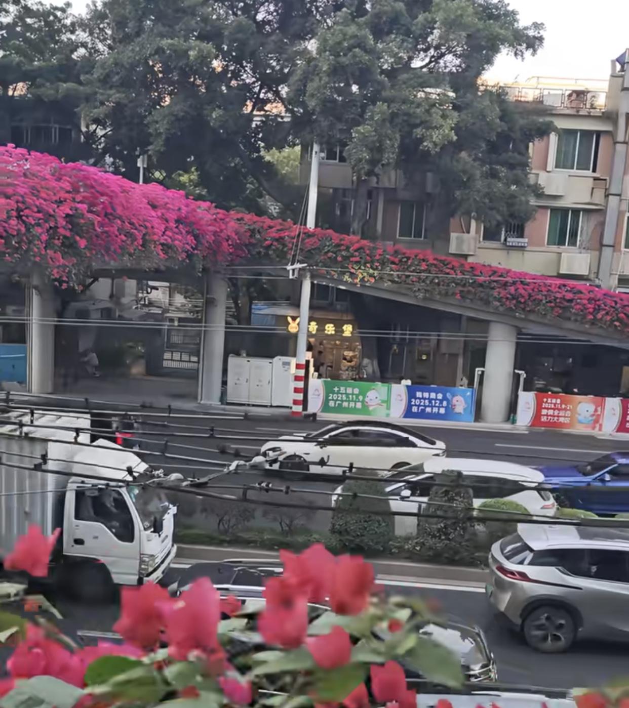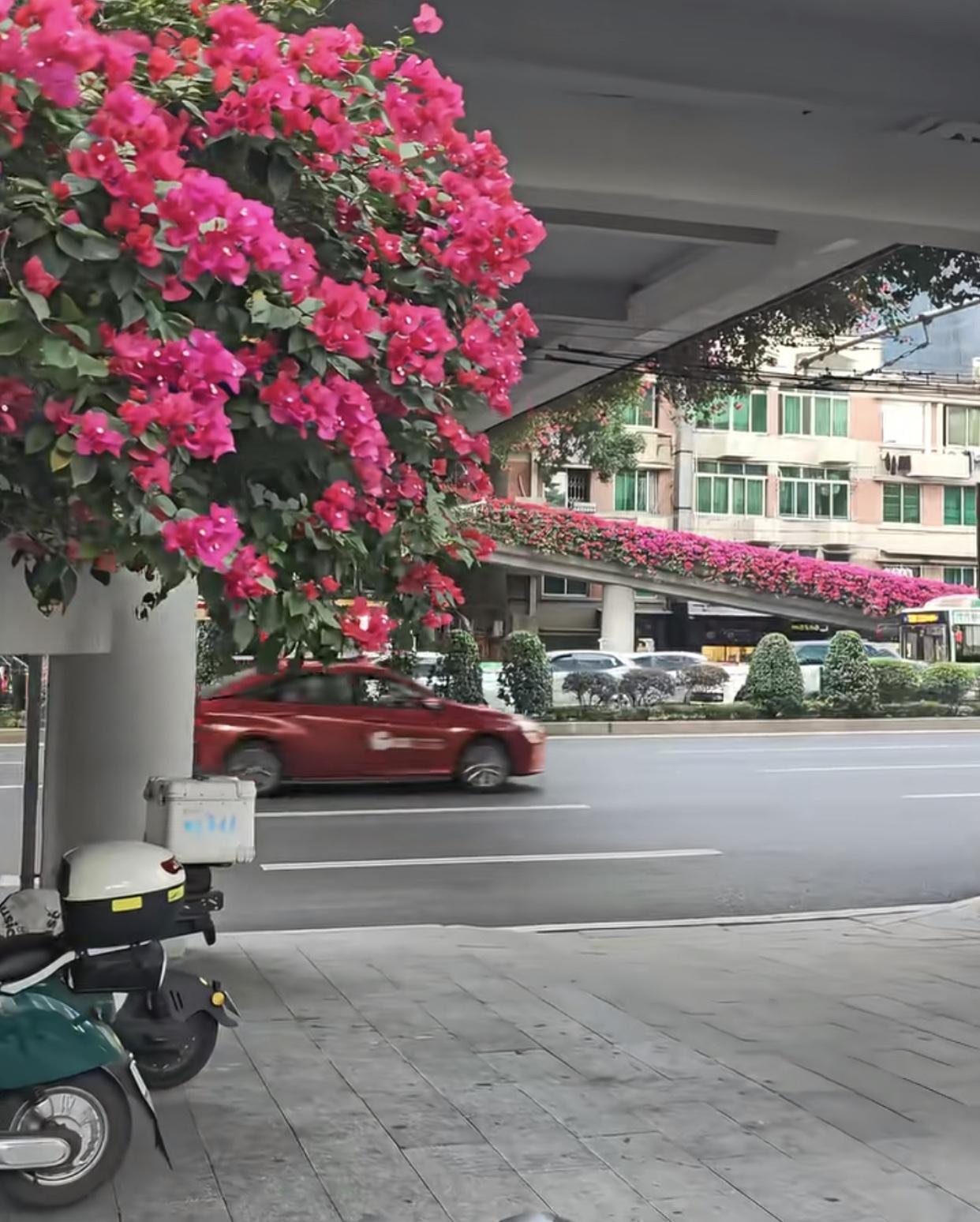 这是广州街景! 估计北方目前尚处于“光板无毛”阶段,广州却一片艳丽。 广州东风西路广医门口天桥这种花也是花下了很多“血本”,时不时要加花肥,沿途都有“滴水灌输”,这些都要花钱,也能赚钱,广州人常说:“小财不出大财不入!” 这种“街景”确是广州首创,“花城”绝非浪得虚名,现岭南众多城市已普及,都波及到了江浙一带的城市。前年去北京旅游过年,看到树都光秃秃的,一下很不习惯。广东的景北方没有,北方的景广东也不一定有,比如雪景。 花城广州,除了过完春节电鸡又开始“乱飞”外,一切都很美好。