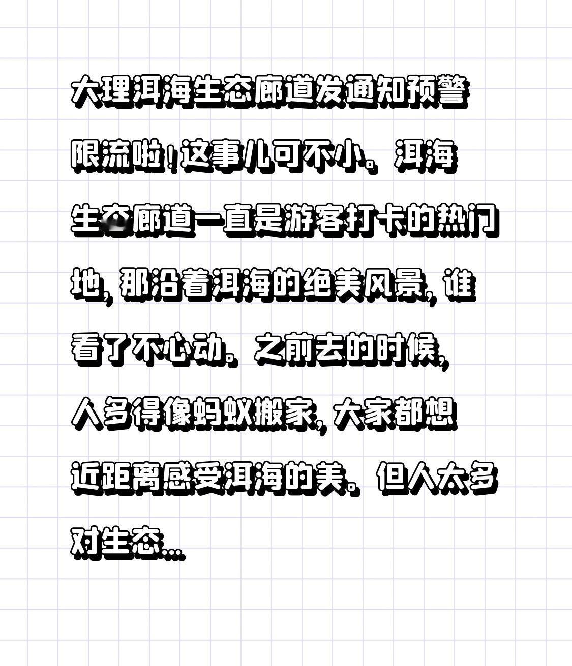 大理洱海生态廊道发通知预警限流啦! 这事儿可不小。洱海生态廊道一直是游客打卡的热门地,那沿着洱海的绝美风景,谁看了不心动。之前去的时候,人多得像蚂蚁搬家,大家都想近距离感受洱海的美。但人太多对生态环境压力也大。这次限流也是为了保护洱海生态,让它能一直美下去。想想也是,如果人无节制地涌入,洱海的生态平衡被破坏,那以后就看不到这么美的景色了。希望大家都能理解这个通知,有序游玩,一起守护洱海的美。