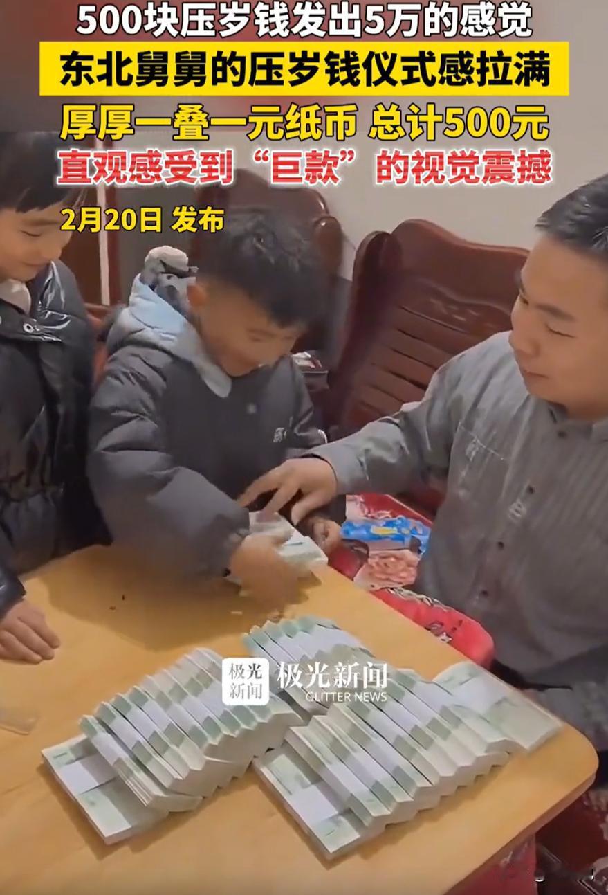 不愧是东北舅舅!黑龙江,一位舅舅为了过年期间给外甥们发钱,专门兑换了几千块的一元纸钞,面对晚辈们的拜年,舅舅直接一叠一叠的甩出去,500块硬是让弄成了50000元的气势。把发压岁钱这件事,整出了新高度 在过年前,这舅舅年前专门跑银行,没换百元大钞,而是换了几千块的一元纸币。崭新崭新的,码得整整齐齐。到了过年孩子们来拜年的时候,好戏开场了 外甥外甥女们排着队,挨个给舅舅鞠躬拜年。舅舅也不含糊,大手一挥,根本不给零的,直接拿起桌上码好的一叠叠一元纸币,一叠就是一百张,相当于一百块。一个孩子过来,他啪地甩过去五叠,整整五百块。那场面,不知道的还以为在搞什么大项目分红,视觉效果拉满 孩子们呢,一个个眼睛都亮了。你想啊,给他们五张一百的,塞兜里就完了。可这五百张一块的,抱在怀里是厚厚一摞,沉甸甸的,那感觉完全不一样 有网友说:这是在银行上班的,否则这一元纸币根本弄不到 其实还真没那么复杂,一般要在银行换一块钱的纸币,有两条路:一种是直接去柜台拿,一种是提前约好了再去拿 先说第一种,直接去柜台。现在大部分银行网点都备着一种叫零钱包的东西。这玩意儿就像个现成的零钱礼包,里面把一块、五块、十块都配好了。你要换几百块钱的零钱,到柜台跟柜员说一声,人家直接就给你拿出来了 当然,过年期间可能就需要第二种,就是提前预约,手机银行都有功能,哪天去、换多少、要什么面值的,自己在手机上填好,到点儿去拿就行 话说回来,这位舅舅给的不仅是钱,更是一份独特的过年体验,孩子们抱着那一堆一块钱,可能会一张一张地数,会想着怎么花,这个过程本身就充满了乐趣 雪饼说