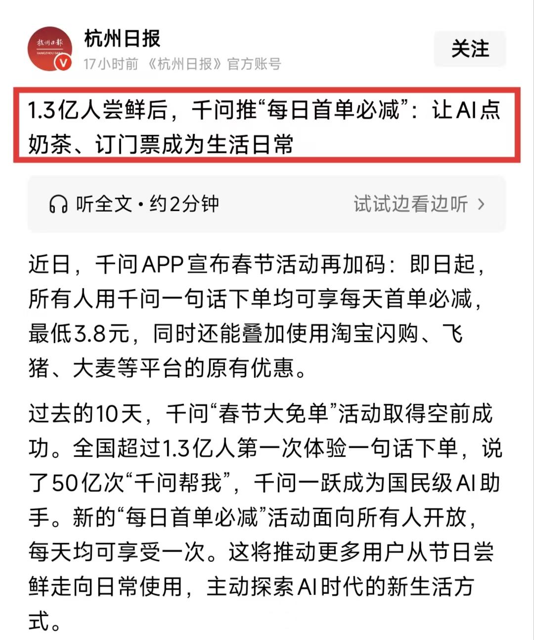 这个春节,AI正在悄悄改变我们的生活方式! 要说这个春节让我们感触最深的是什么?那绝对是AI了。 尤其是千问,凭借强大的AI办事能力,春节又搞了一波请客活动,一跃成为国民级AI助手。大家都体验到了,不用手动操作,直接跟千问说一句话,它就能帮忙订餐饮、买年货、买电影票和景区门票等等等等,动动嘴就能让千问把事儿办了 不仅如此,免单卡之后,2月17日开始,千问还上线了一个很实在的福利,每天通过“千问帮我”完成的第一笔订单,都能享受随机立减,而且是天天都可以参与,不是一次性活动。 看了一下,这个优惠门槛很低,立减金额最低3.8元,身边不少朋友都领到了8.8元,像我们平时买奶茶、吃早餐,还是很香的。 最方便的一点是,这个立减可以和淘宝闪购、飞猪、大麦这些平台原本的优惠叠加使用,相当于双重省钱,不用纠结选哪个,直接一起用就好。 其实现在AI工具越来越贴近生活,千问这种既能帮我们省事办事,又能带来一点真实实惠的设计,还挺接地气的。 如果你最近正好要买票、囤货或者订餐饮,不妨顺手体验一下,省心的同时还能省下一笔小钱,简单又实用。 AI生活方式是大势所趋,每一个都应该重视起来,多去试一试、用一用总没错。