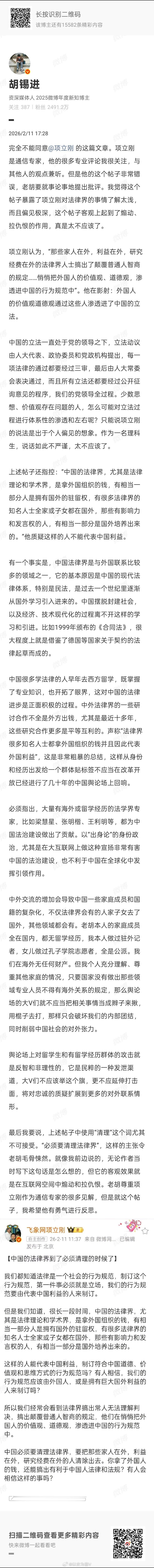 【老胡批评项立刚】老胡说:项煽动仇恨,言论有害中国法治建设,不利于中国全球化的引领,要项反思;