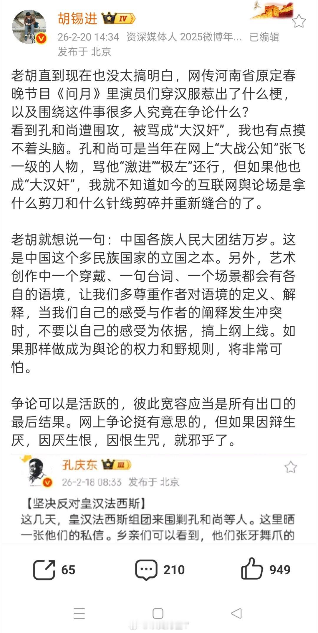 【别人批评孔庆东】老胡说:我虽然搞不明白,但是大家不要搞上纲上线,希望大家彼此宽容;