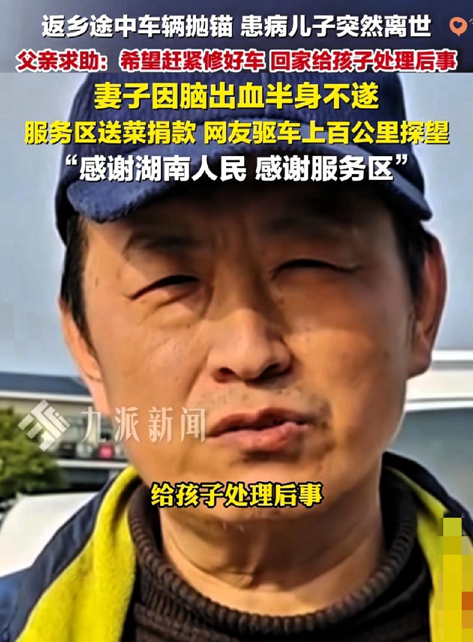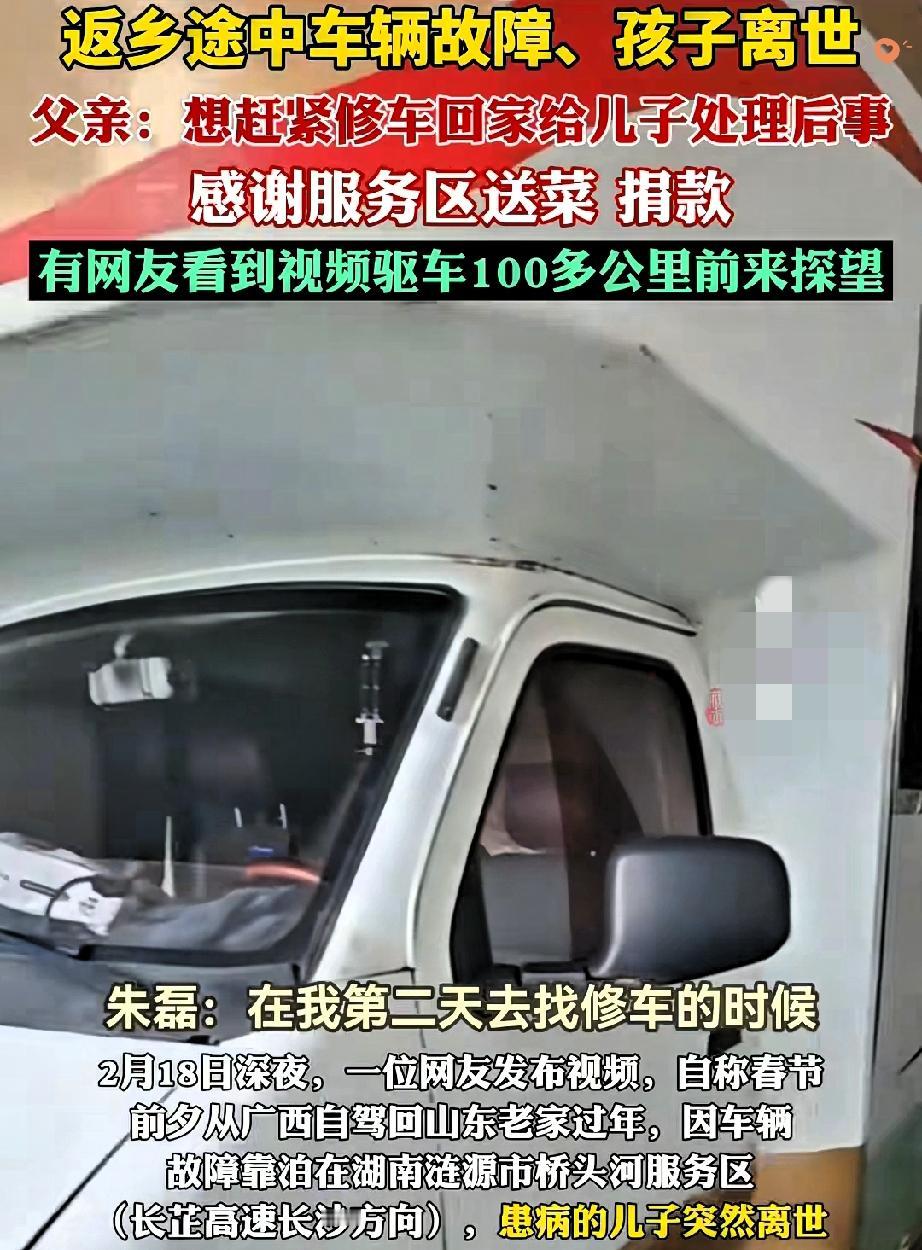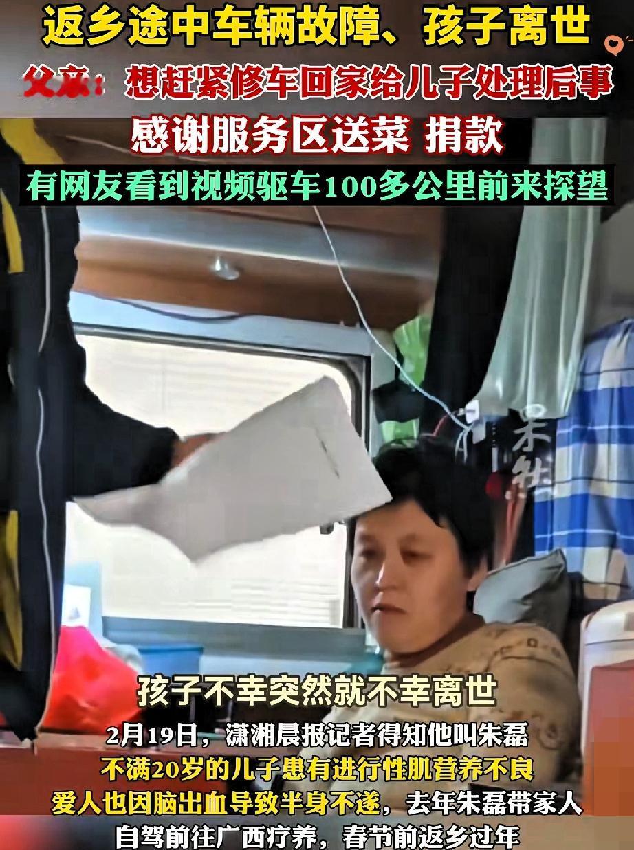 团圆路变伤心路,这位父亲撑得太让人心疼了 本是满心欢喜回家过年,山东大哥朱磊带着偏瘫妻子和患病儿子从广西返乡,没想到车在湖南高速服务区突然抛锚。 更揪心的是,不到20岁的儿子旧疾突发,再也没能醒过来。 一边是坏在半路的车,一边是天人永隔的孩子,还有身边需要照顾的妻子,这位硬汉瞬间被击垮,举目无亲,连后事都没法顺利处理。 好在人间总有温暖接住绝望。服务区工作人员主动帮忙,提供食宿、联系维修、送吃送喝;还有两位网友放弃过年,驱车百公里赶来搭把手。 生活再苦,也有人偷偷为你撑伞。比起团圆的热闹,这些陌生人的善意,才是寒冬里最实在的光。 愿这位大哥挺住,往后余生,多些平安,少些磨难。 如果你在路上遇到难处,愿意接受陌生人的帮助吗?你被这份善意暖到了吗?