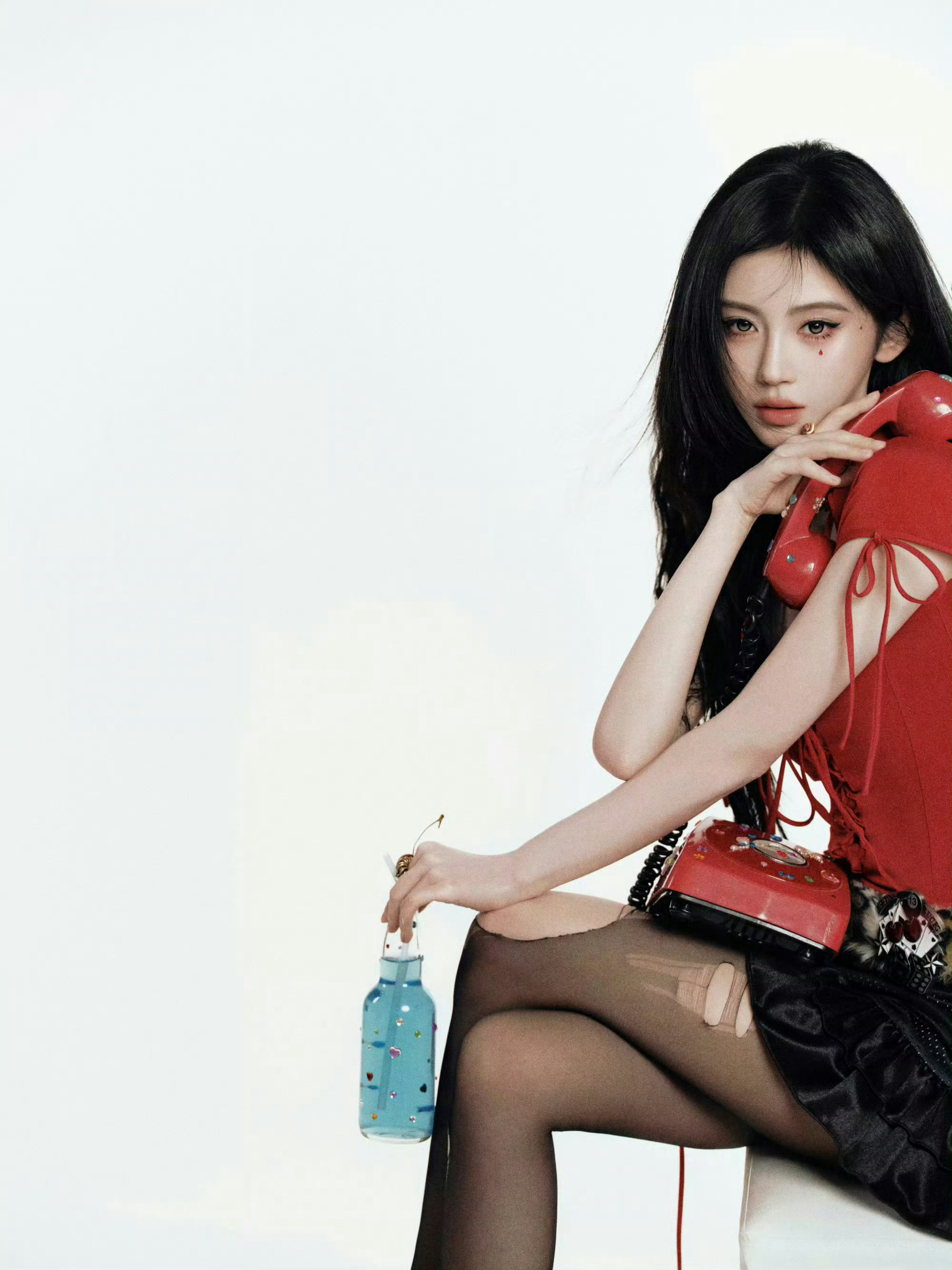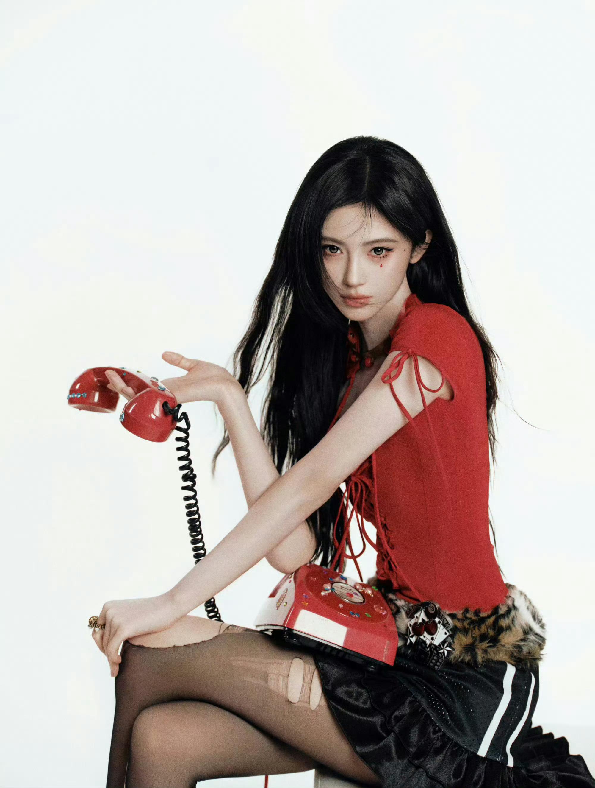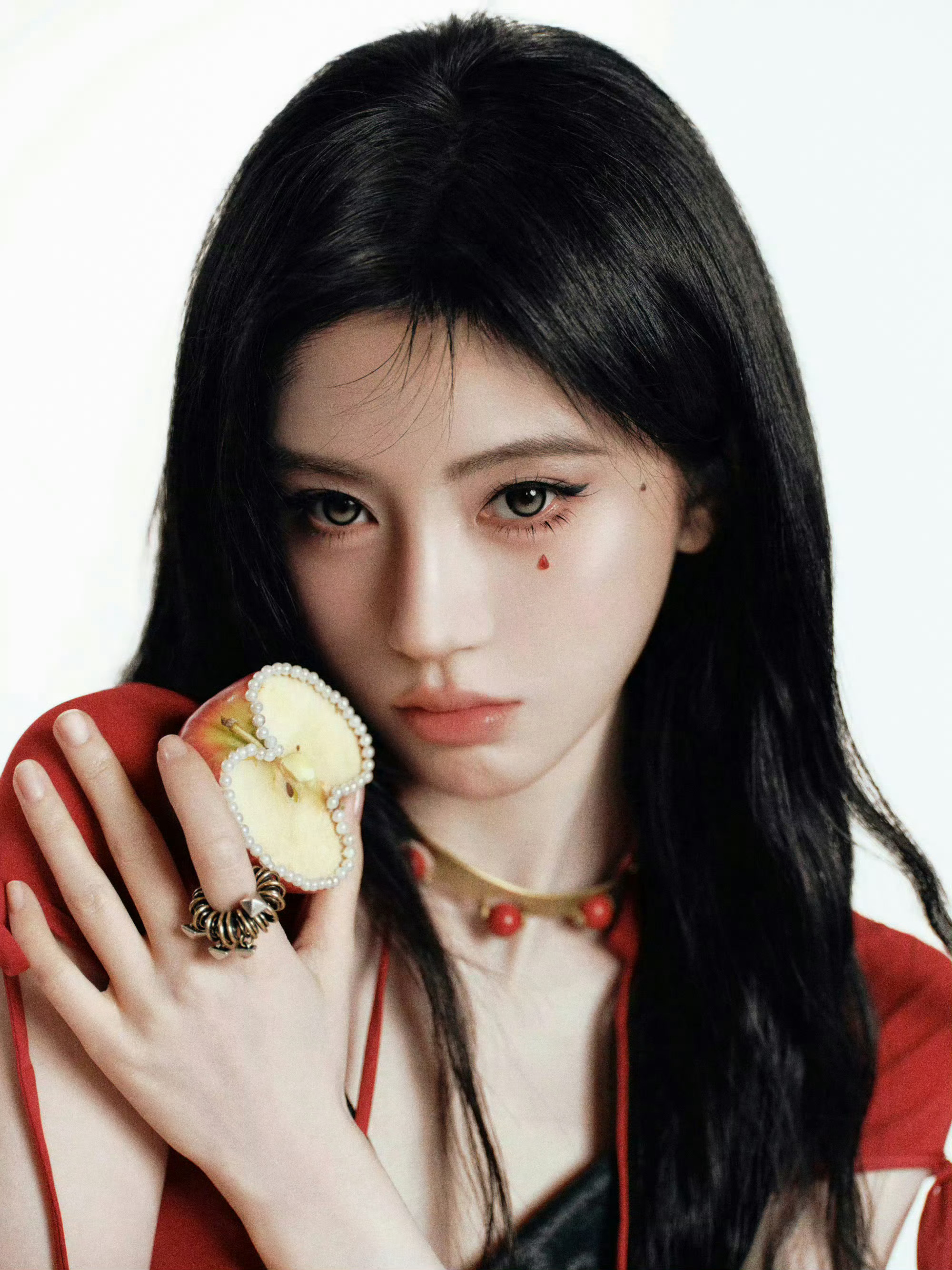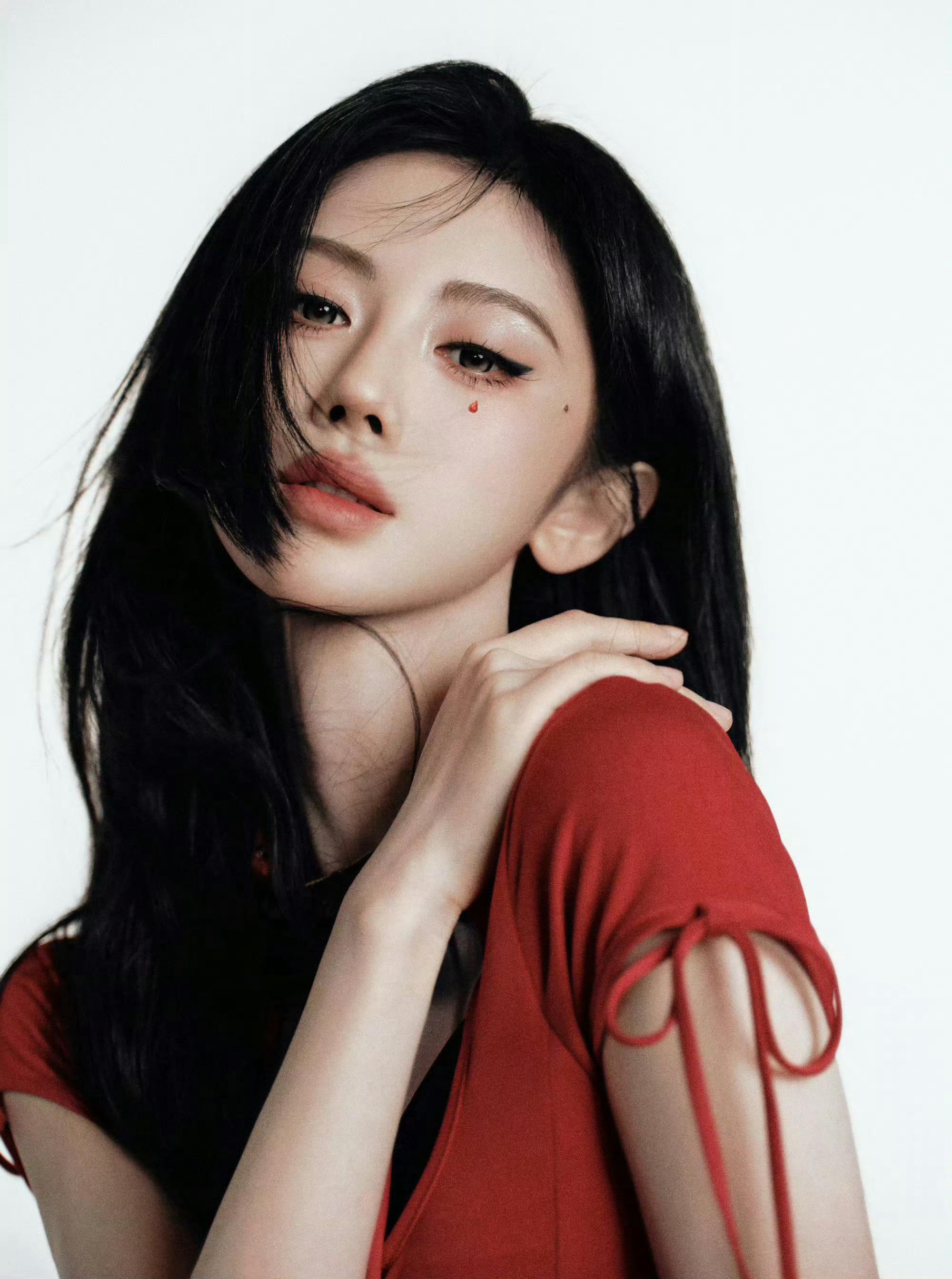 虞书欣新年写真又甜又辣虞书欣新年写真 黑发红装造型亮眼,露肩设计添性感,甜辣氛围