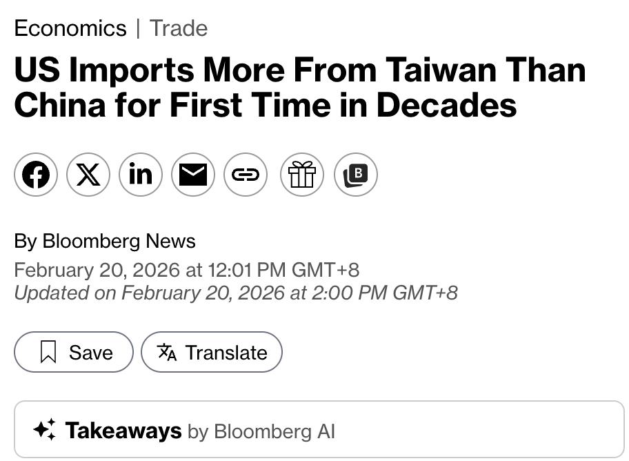 美媒:美国数十年来首次从台湾地区进口的商品超过从中国大陆进口的商品。 据美国商