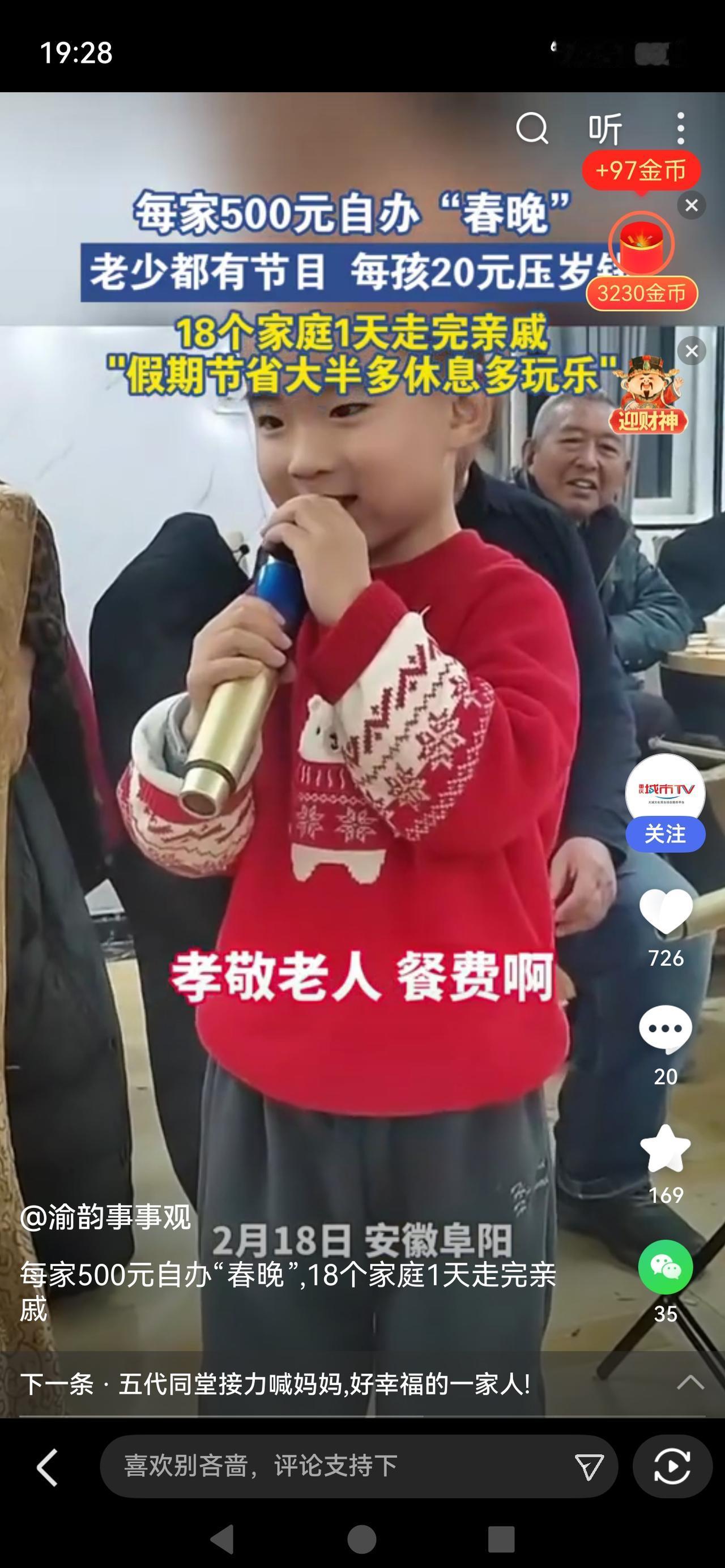18个家庭每家500自办春晚光速走亲戚 安徽阜阳18户家庭,每家出500元众筹办家庭春晚,一天走完所有亲戚,直接火遍全网。这不是简单的聚会,而是年轻人对低效过年的温柔反抗。往年走亲戚,奔波送礼、客套寒暄,几天假期全耗在路上,亲情淡如水;今年聚在一起办晚会、吃团圆饭、发小红包,钱花在明处,情聚在实处。 本质上,大家厌倦了形式主义的拜年,渴望有温度、高效率、真舒服的团圆。这种模式不攀比、不折腾、不内耗,把面子工程变成真心交流,既照顾老人孩子,又解放年轻人时间,戳中了无数家庭的过年痛点。亲情从“赶场式打卡”变回“围坐式陪伴”,这才是过年该有的样子。 这才是当代过年的最优解!必须全国推广! 500元不多,却省去奔波劳累;一场春晚,把疏远的亲人重新拉到一起。不搞虚的,不费腿不费嘴,热闹又体面,轻松又暖心。过年不该是负担,而是一家人开开心心、舒舒服服。 为这个创意点赞!愿更多家庭告别无效拜年,把年味找回来,把时间还给自己,把亲情留在心里!新的一年,团圆不折腾,幸福更长久!热点话题