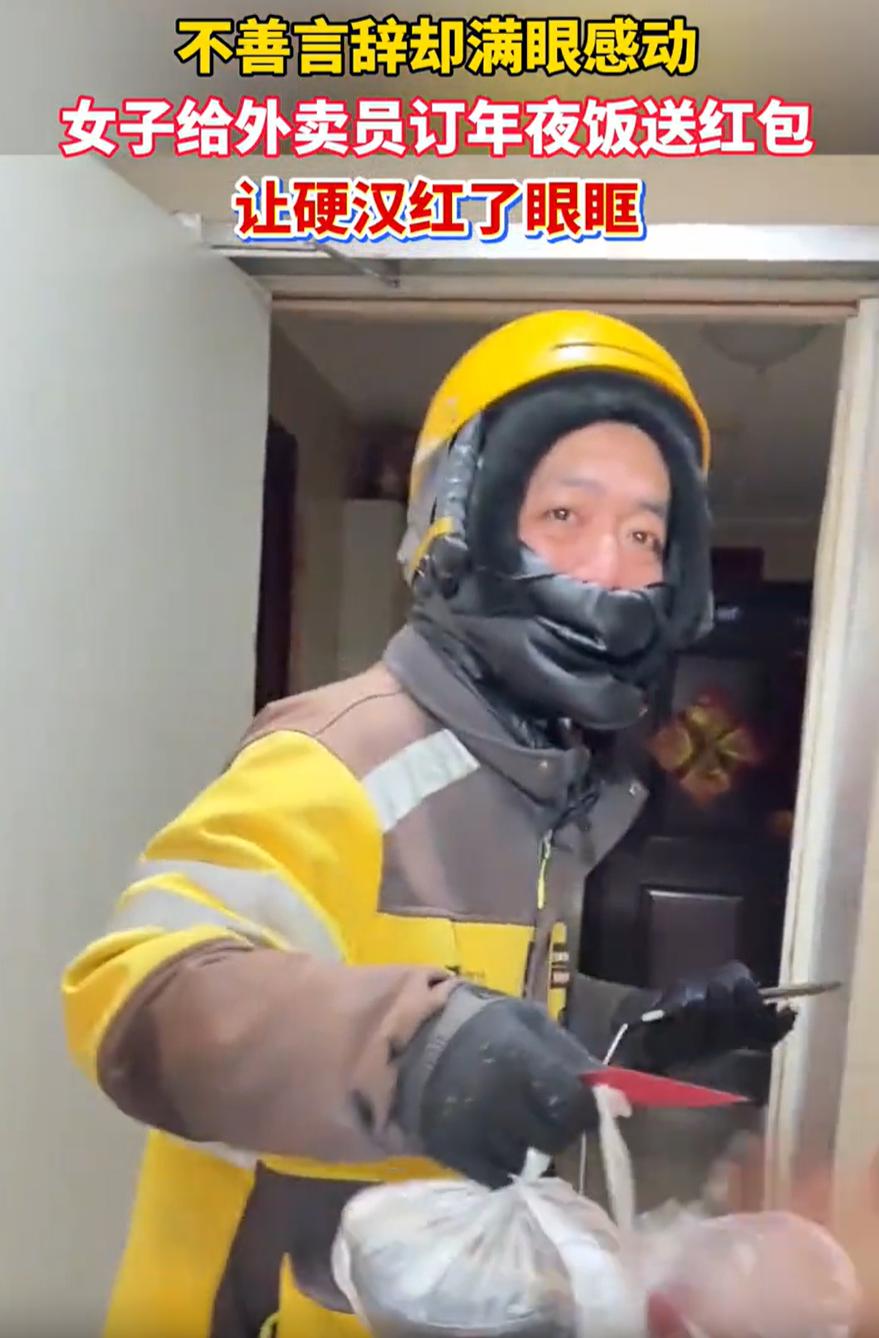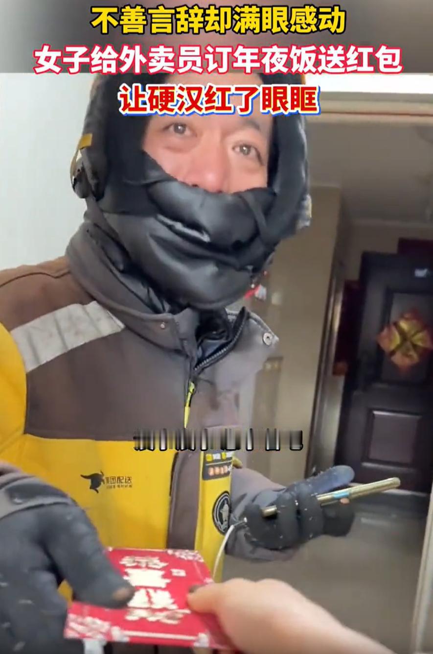 看哭了!河北邯郸,女子在除夕夜点了一份外卖,可当骑手敲门送餐时,女子却摇了摇手没接过来,反倒是和骑手说:我这是给你订的!然后还拿出一个红包送给对方,而女子的举动,也是让这位硬汉当场红了眼眶 除夕夜晚,女子和家里人热热闹闹地吃完了年夜饭,这会儿正瘫在沙发上刷手机消食。她看着电视里热闹的春晚,突然冒出一个念头:这大过年的,街上还有人跑外卖吗? 她好奇地点开手机软件,划拉了几下,发现还真有骑手在线,随后她就点了一份饺子 没过一会,一位骑手上门送餐,骑手把外卖递过来,女子却直接伸手推开,骑手一瞬间还以为是送错了 可下一秒女子却说:这是给您订的,没事,给您一个红包,没事,没事,您拿着吧,新年快乐 骑手虽然没说话,但从他的眼神中能看出是从最开始的疑惑变成了感动,甚至还有泪水在眼眶上打转 事后,女子把这事发到网上,有网友说:可以想象,这老哥下去会一边吃一边哭,一个小小的爱心举动都可以支撑他有了继续努力生活的动力 其实仔细想想,女子那句没事说了好几遍。与其说是在安慰骑手,不如说她也在化解自己的不好意思 她怕对方拒绝,怕这点心意让对方有负担。而骑手的沉默和泪花,也说明了一切,他收下的不只是饺子和红包,更是这份来自陌生人的体谅 这件事让我想起一句话:世上只有一种英雄主义,就是在认清了生活的真相之后,依然热爱生活 同样,世上也只有一种温暖,就是在自己过得还不错的时候,愿意分一点光给正在赶路的人