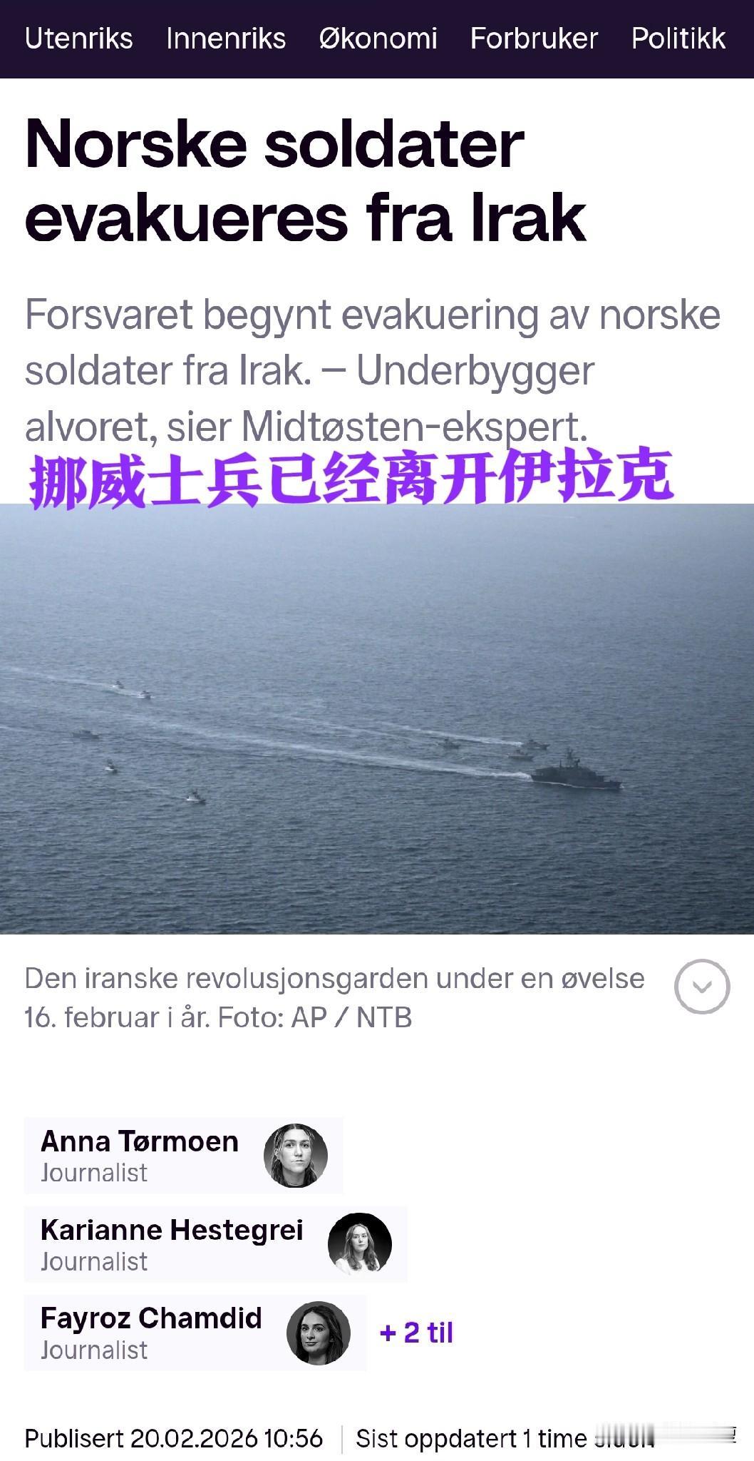 因伊朗局势紧张,驻扎在伊拉克的挪威部队证实已经撤离。 同样匆匆撤离的还有德国等北约“盟友”的部队——就似乎北约第五条款并不存在,而这帮子所谓的“盟军”、“军事伙伴”在可能遇到麻烦的瞬间,怎么都是第一时间撒开腿子以逃跑为先。 看来情况真的很严重,北约这欧洲帮怂货全在发布撤军撤侨以及旅行禁令。