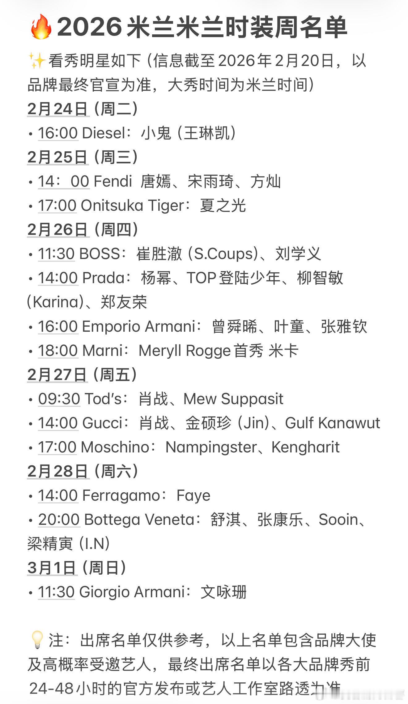 2026秋冬米兰时装周日程 看点将于2月24日至3月2日举办,Demna执掌Gucci后的首秀、Fendi新任创意总监Maria Grazia Chiuri的首秀等三大设计革新成为核心焦点!🌟特别值得关注的内容如下:Gucci:新任创意总监Demna的第一个正式秀场系列将于2.27日举行;Fendi:新任创意总监Maria Grazia Chiuri将在2.25日带来女装系列的首秀;Marni:迎来新任创意总监Meryll Rogge首秀,时间为2.26日其他品牌动向:Prada、Bottega Veneta延续稳定输出,秀期覆盖2月26日至28日。与米兰-科尔蒂纳冬奥会联动,Emporio Armani展示意大利代表团装备,K-Way以"米兰山脉"滑雪论坛替代传统秀场。