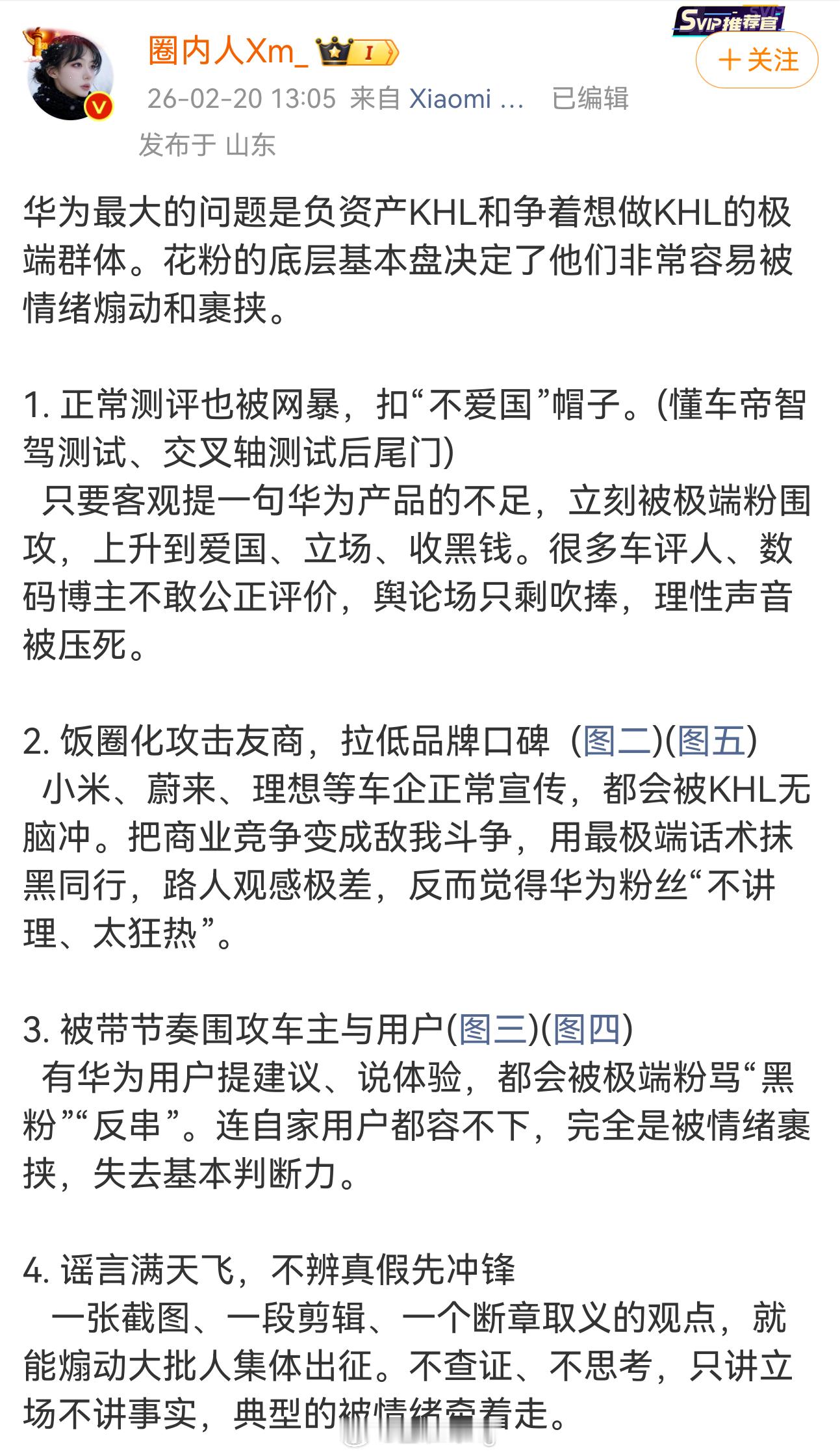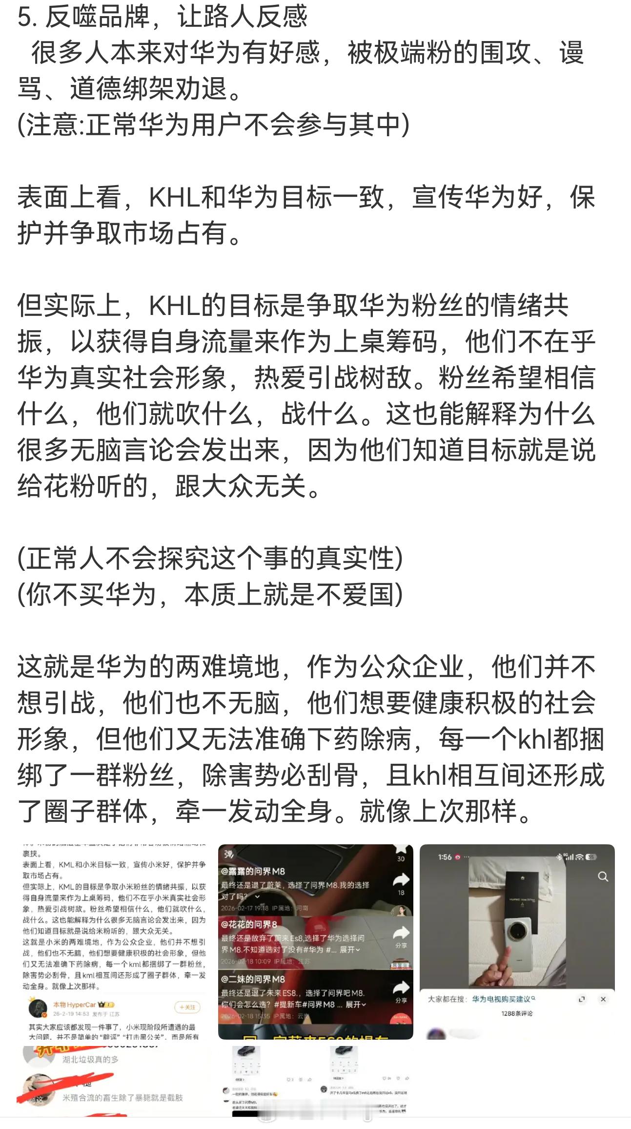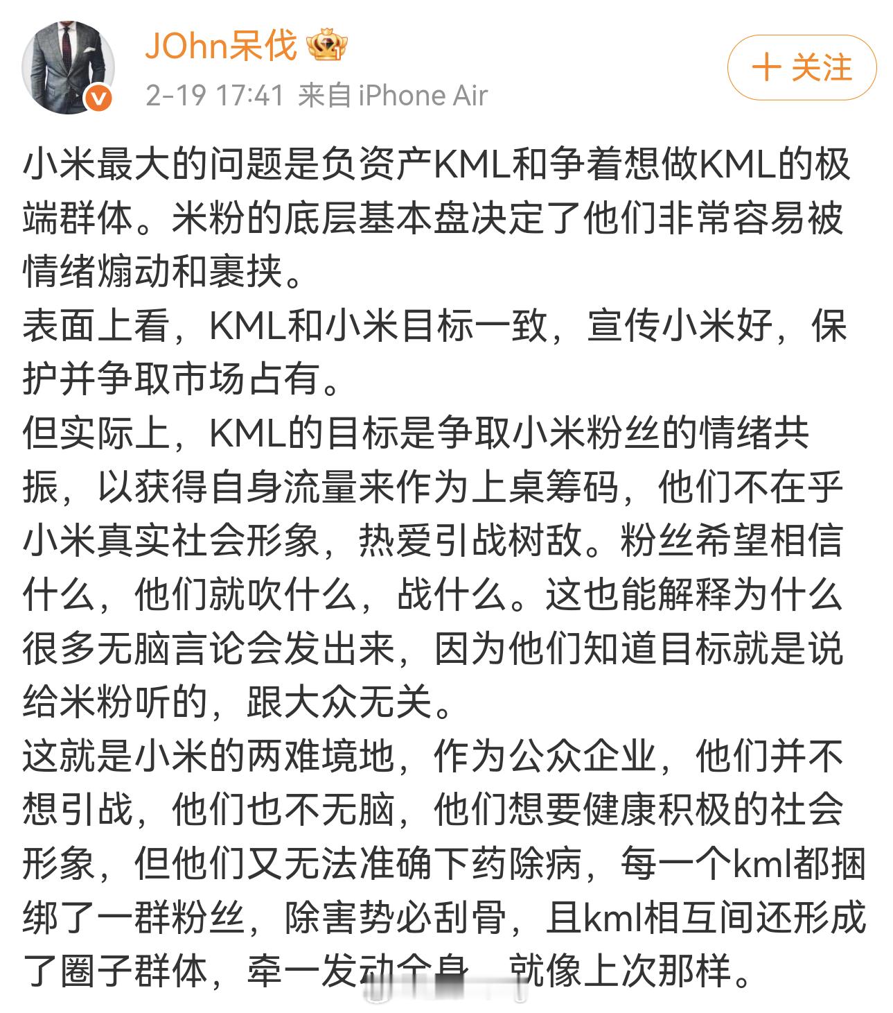 KML 和 KHL 最大的区别就是没有深度绑定其实你细看之下,很多 KHL 已经放弃了带节奏,转而做专业的内容,而花粉是能接受的,并且是带来流量反观 KML,除了带节奏、搞对立,真正的正向内容只有很少粉丝愿意买单,所以流量寥寥,也是为何说饭圈化的原因至于提出 KML 的问题的博主,是原先小米 su7u 的准车主,我感觉他写的那段文章是很有水平的,包括评论区的评论,也揭示了一些问题,大家也可以看看