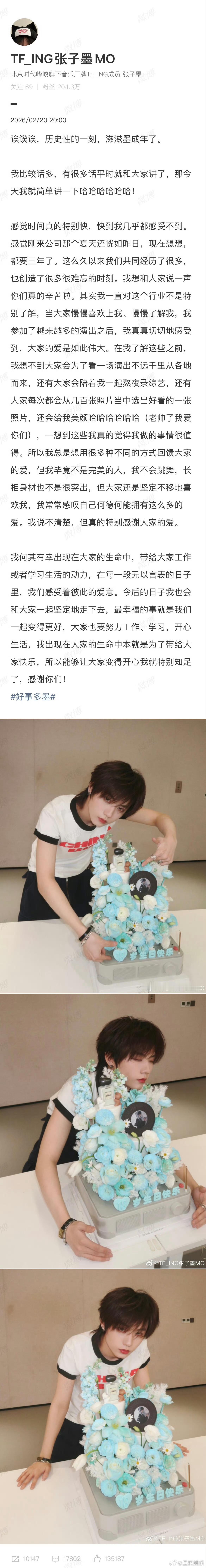 张子墨长文“希望18岁身边依然有音乐和你们的陪伴。” 昨天还是17岁的张子墨,今天在零点准时兑现了这句承诺。 一篇长文,写不尽三年来的跌跌撞撞,却让所有人看到他从“被质疑”到“全开麦”、从15岁到18岁的每一步。 他说自己“何德何能”,可粉丝说:因为你值得。 成年快乐,张子墨。
