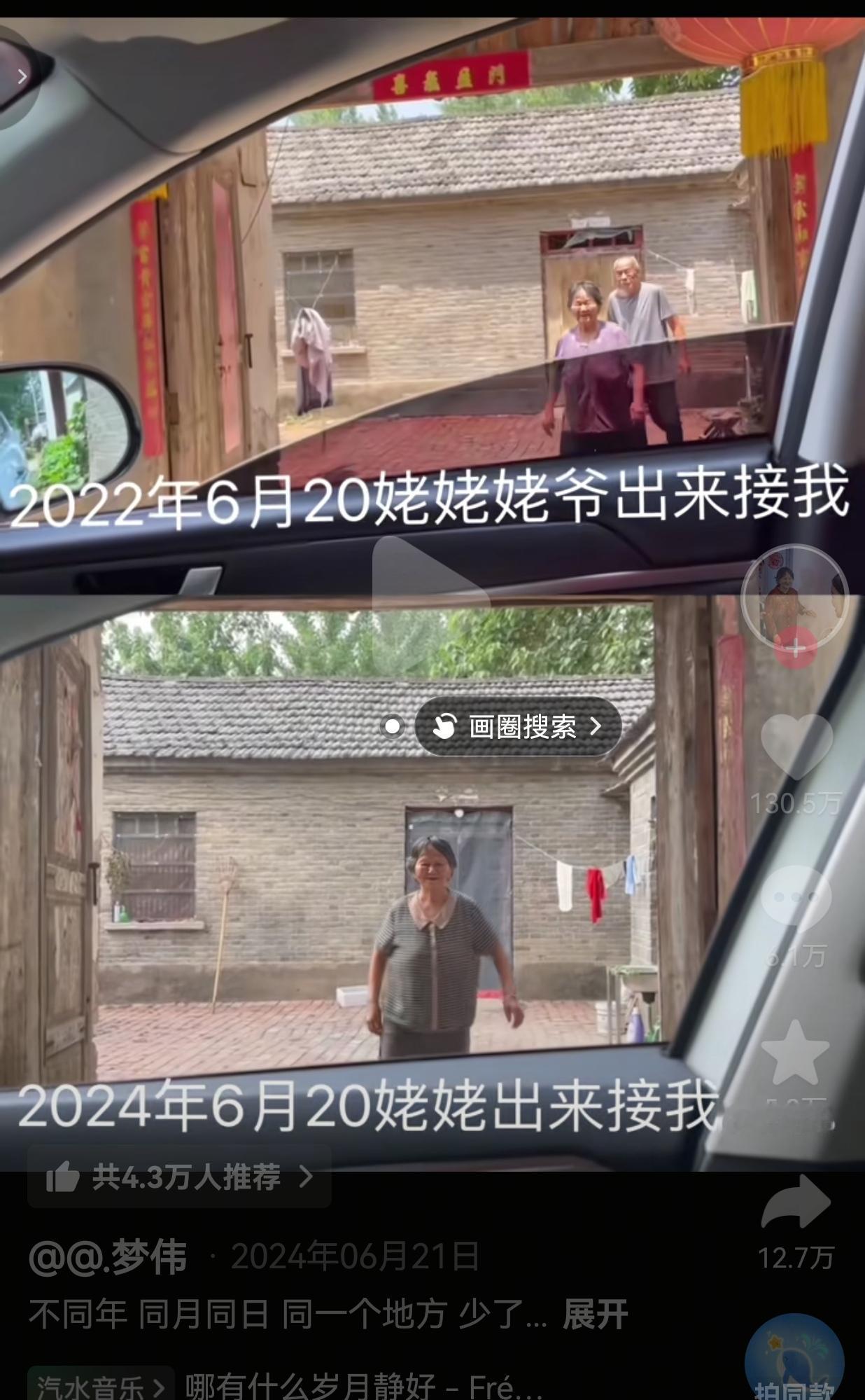 看哭了!两年前姥爷还在,今年只剩姥姥一个人站在门口:有些告别,真的是猝不及防 昨天刷到一条视频,我盯着屏幕愣了好久。 同一个日子,都是6月20号,只不过一个是在2022年,一个是在2024年。仅仅两年的时间,同一个地方,老家的院子。两年前还是姥姥姥爷一起,两年后只剩姥姥形单影只。 2022年的那天,她开车回去,刚拐进胡同,就看见姥姥和姥爷一前一后从屋里走出来,姥爷还穿着那件洗得发白的灰T恤,姥姥扶着门框,眼睛盯着她车来的方向。 那时候她还笑着跟朋友说,她家这俩老人,比GPS还准,每次她回来,他俩准在门口等着。 2024年的6月20号,她又开着同一辆车回去。车停在同一个位置,她降下车窗,看见的只有姥姥一个人。 她还是站在那个老地方,穿着那件她去年给她买的条纹衫,头发比之前更白了,背也更驼了。她笑着朝她挥手,可她看着她身后空荡荡的院子,鼻子一下子就酸了。 评论区里有个网友说:“原来有些告别,根本没有预告。” 可不是嘛。 女子可能总觉得,以后的日子还长着呢。总想着再攒点钱,带姥爷去北京看看天安门。还想着等她不忙了,陪他好好喝顿酒,听他讲那些年轻时候的故事。想着下次回来,还能看见他和姥姥一起在门口等她。 可谁能想到,有些再见,始料未及,真的可能就是最后一面。 现在每次回家,她都不敢太快走进院子。她总下意识地往门口多望两眼,好像下一秒,就能看见姥爷从屋里走出来,笑着骂她一句:“臭丫头,又回来蹭饭。” 可每次,都只有姥姥一个人站在那里,手里攥着她的旧外套,说:“你姥爷总念叨,说你今年该回来了。” 原来,岁月静好是真的,可岁月无情,也是真的。 我们总以为,父母长辈会一直在那里,等我们功成名就,等我们有空回家。可现实是,他们的时间,比我们想象的要少得多。 我们总在等“下次”,等“有空”,等“有钱”,可他们,却在一天天变老,一天天离开。 别等了。 别等你赚够了钱,才想起给爸妈打个电话;别等你有了时间,才想起回家看看;别等他们不在了,才后悔自己当初没有多陪陪他们。 因为有些爱,一旦错过,就再也找不回来了。 最后,想问问大家:你上一次,认认真真地陪爸妈吃一顿饭,是什么时候?
