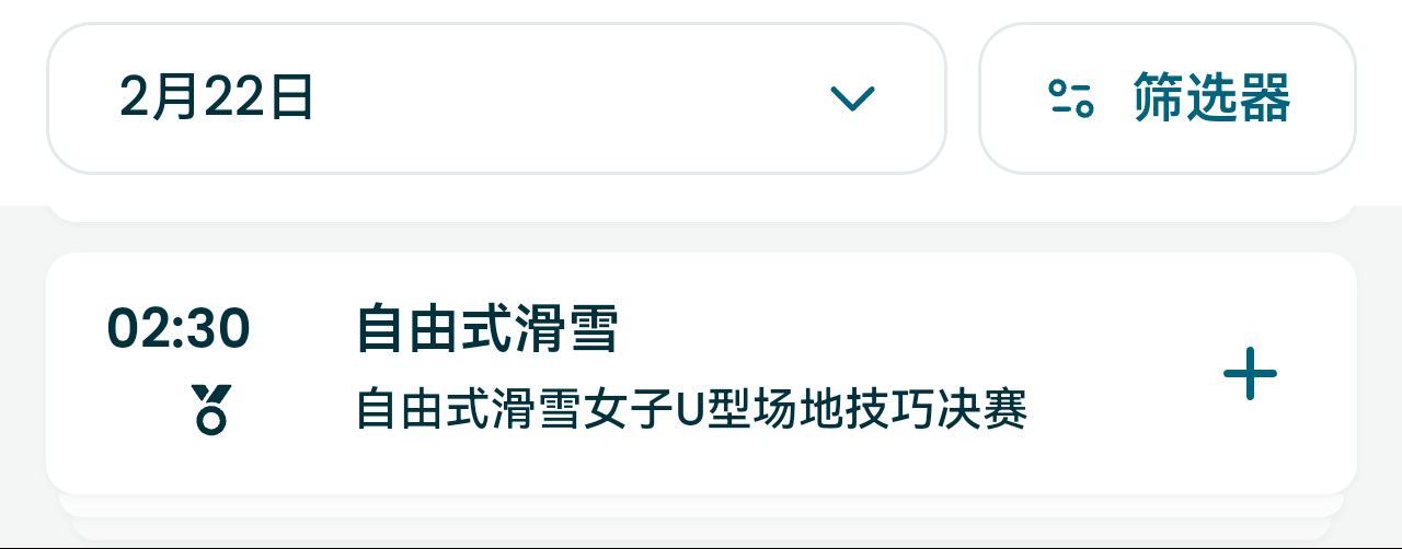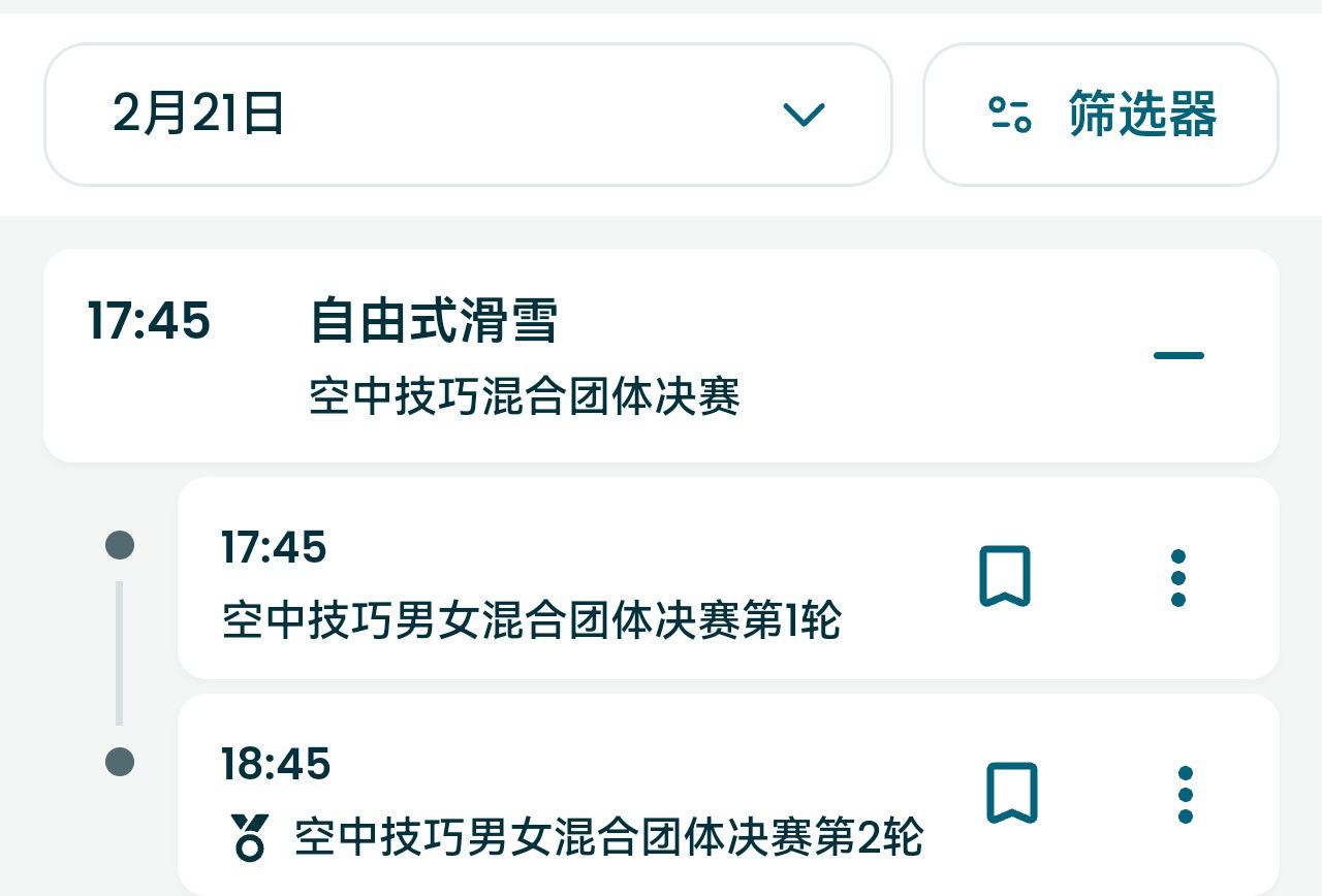 2月21日 17点45 空中技巧混合团体决赛2月22日 2点30 女子U型场地技巧决赛