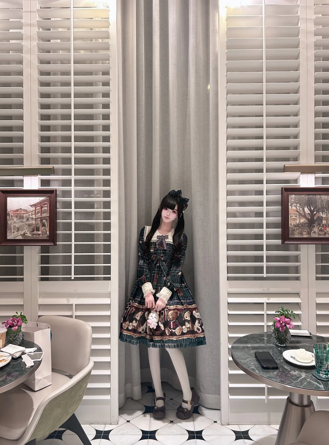 风拂柳,粉樱绽放,我身着浅粉蕾丝旗袍,立于古栏之下。长袖轻笼,盘髻缀珠,耳坠摇曳